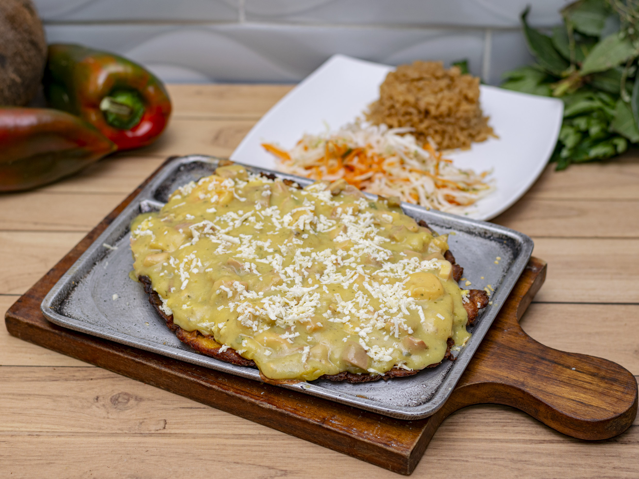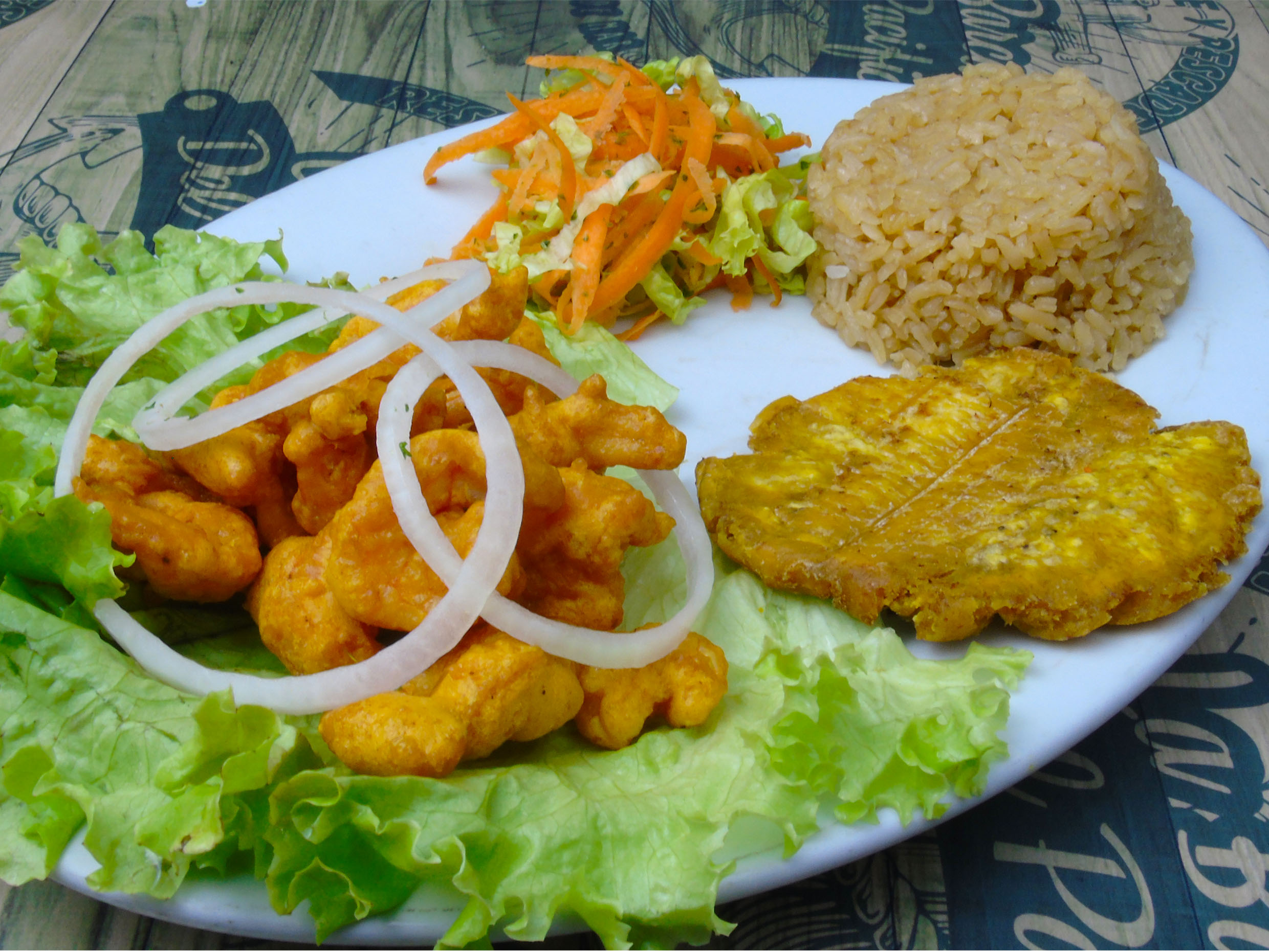 Acompañado con arroz (blanco o coco), patacon