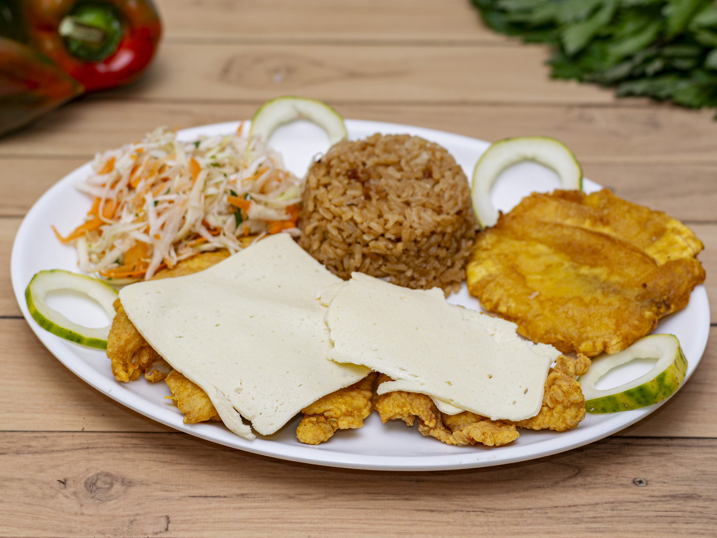 Acompañado con arroz (blanco o coco) y patacon