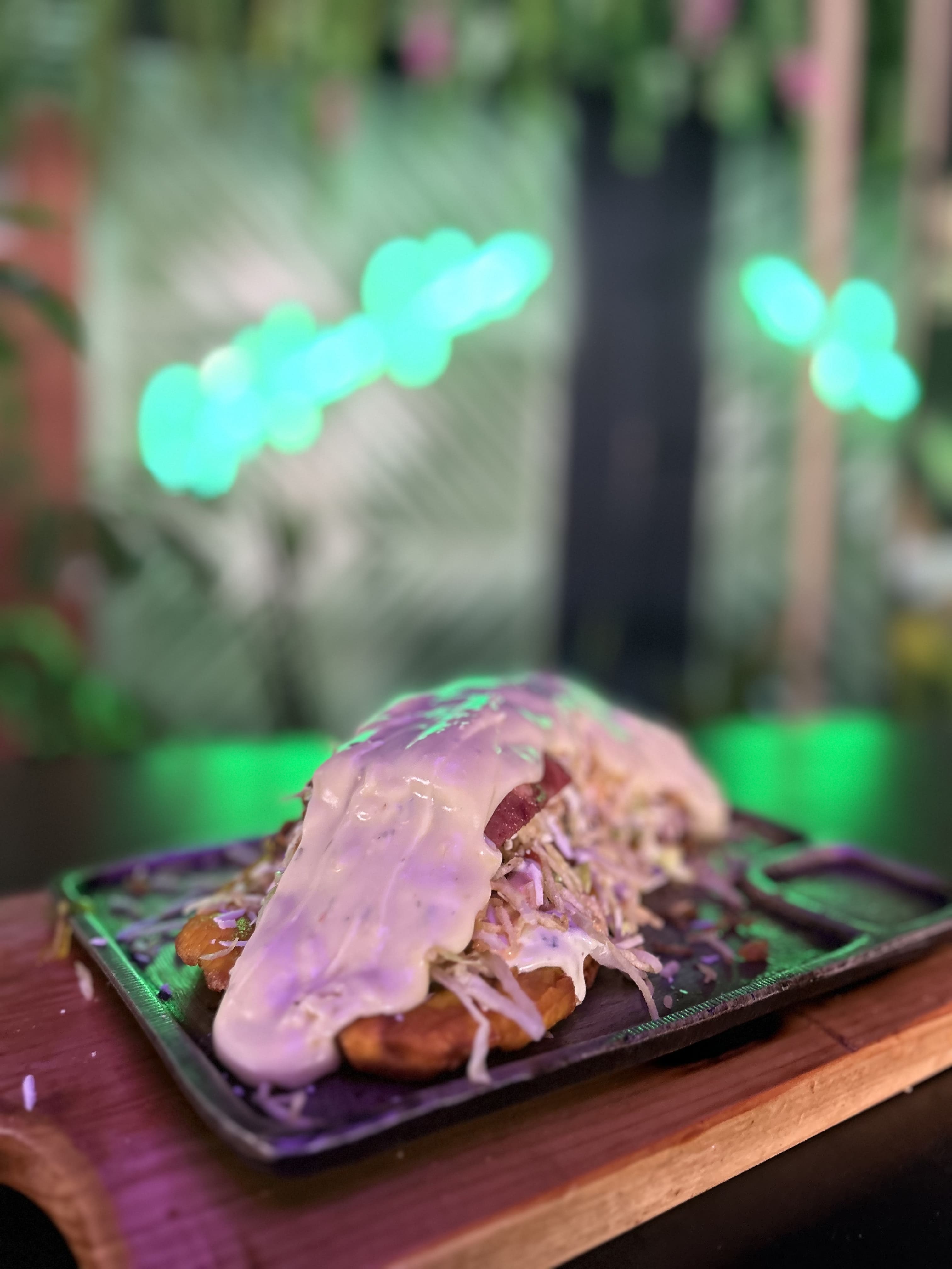 Carne desmechada, pollo desmechado, chorizo ahumado premium, queso gratinado, salchicha de pollo, tocineta, cama de lechuga, plátano.
