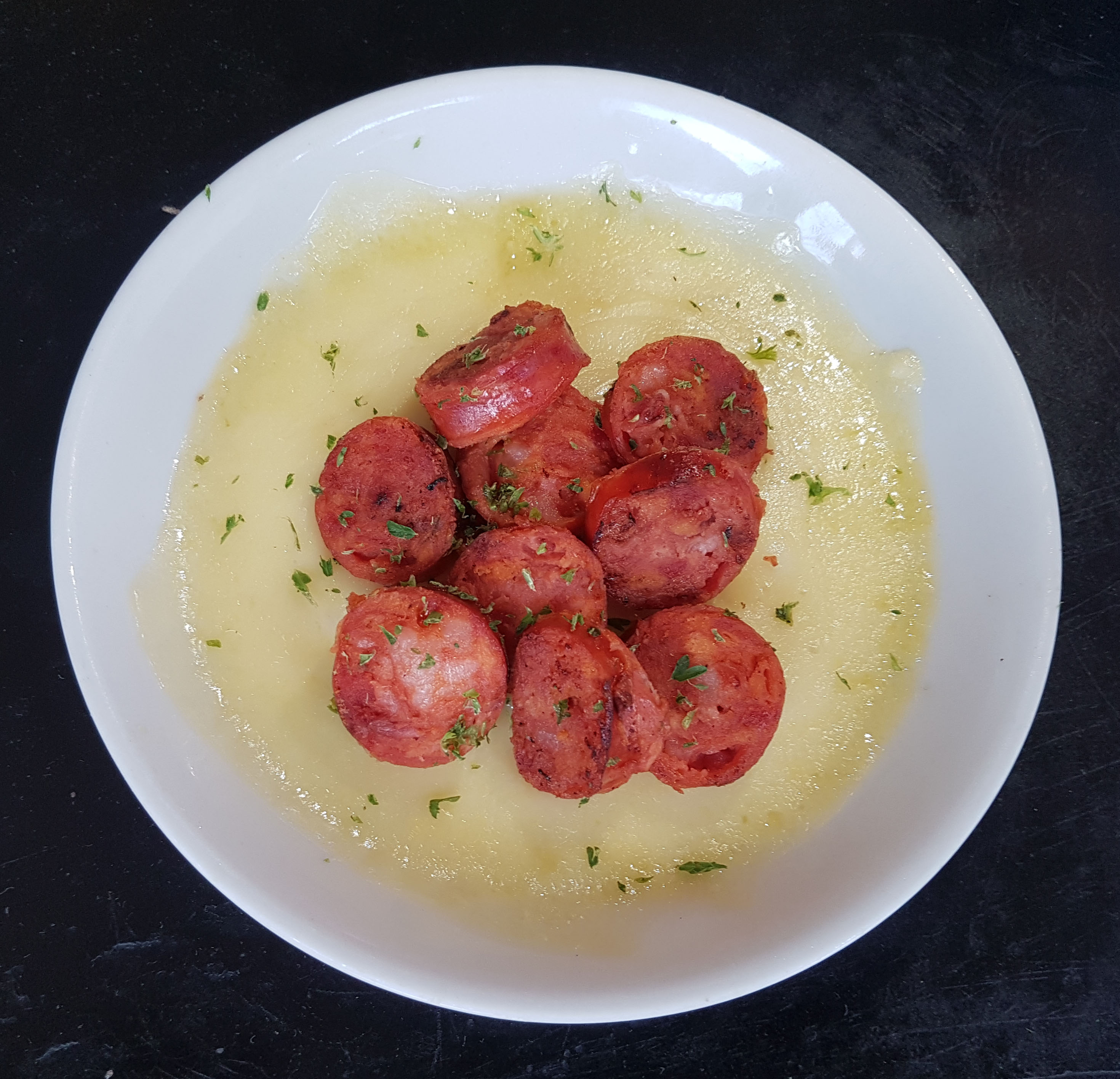 Arroz, chorizo, carne, pollo, repollo, pimentón, cebolla.