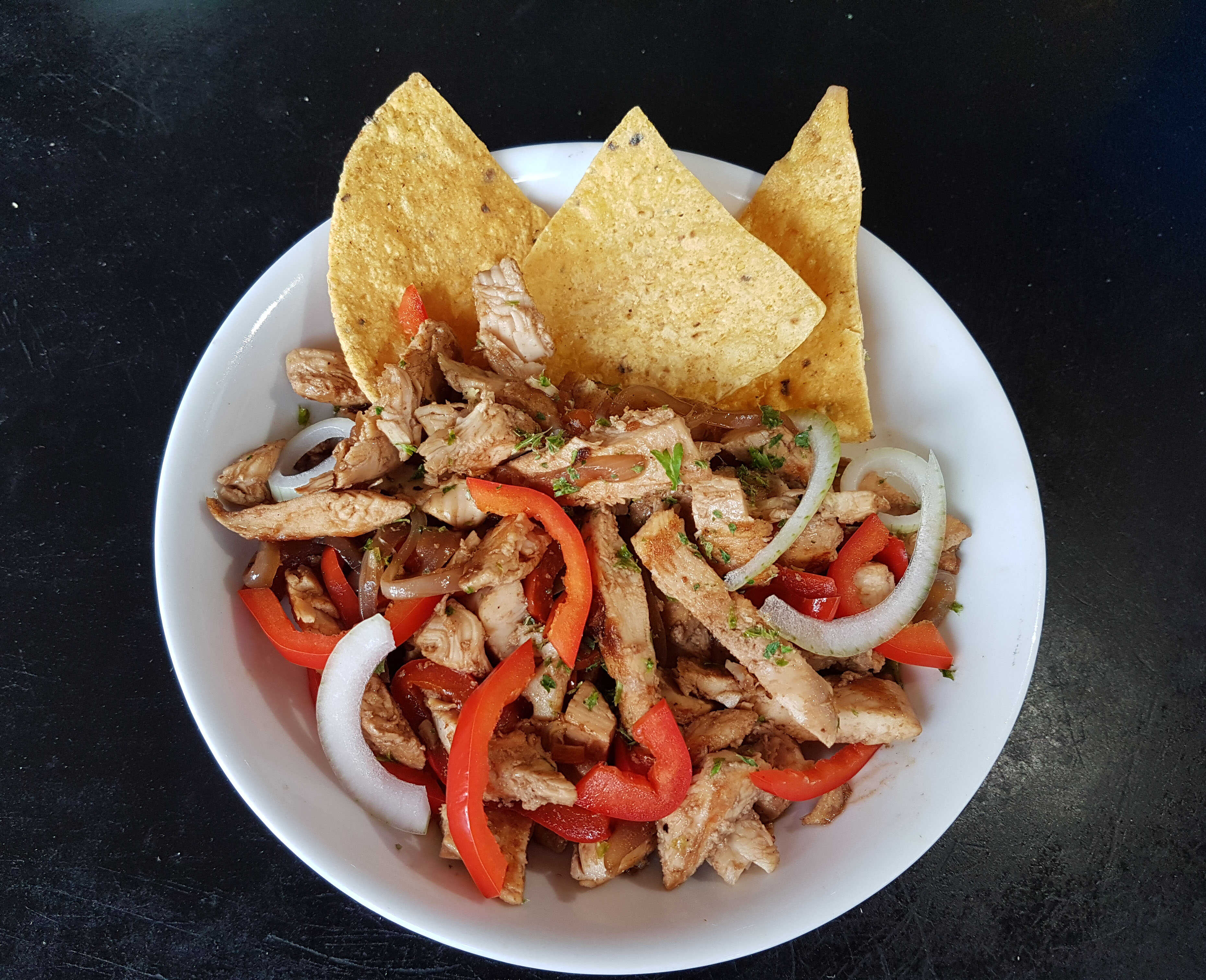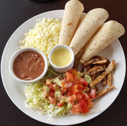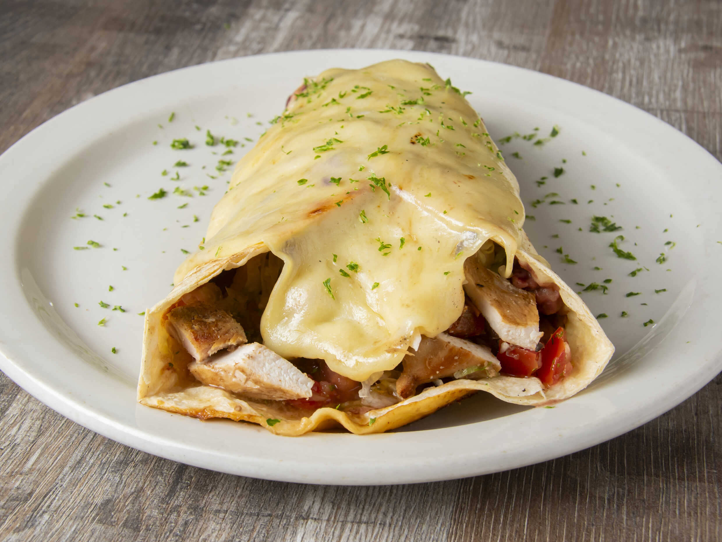 Tortilla rellena de pollo, cebolla, pimenton, recubierto con salsa mexicana y queso gratinado.