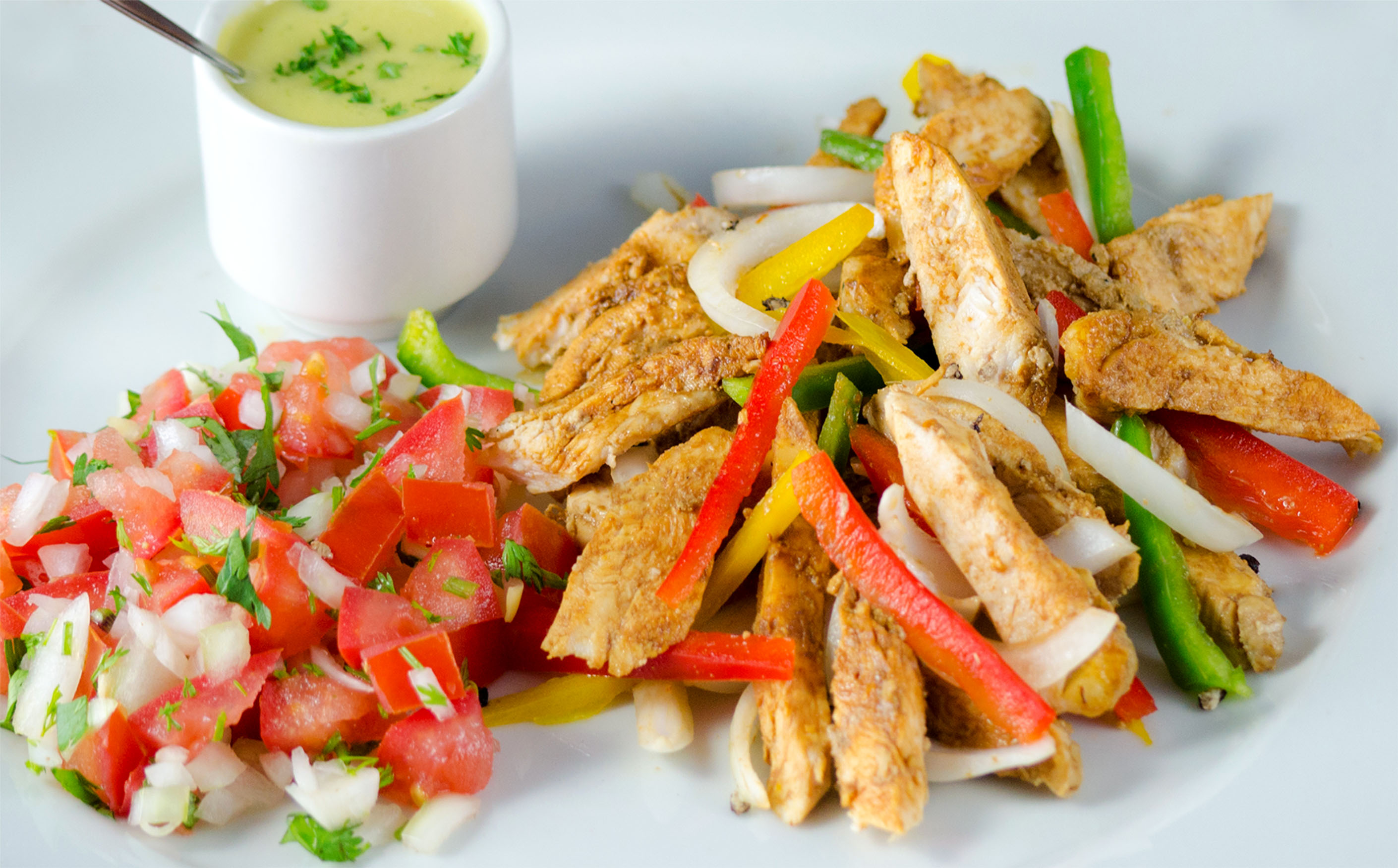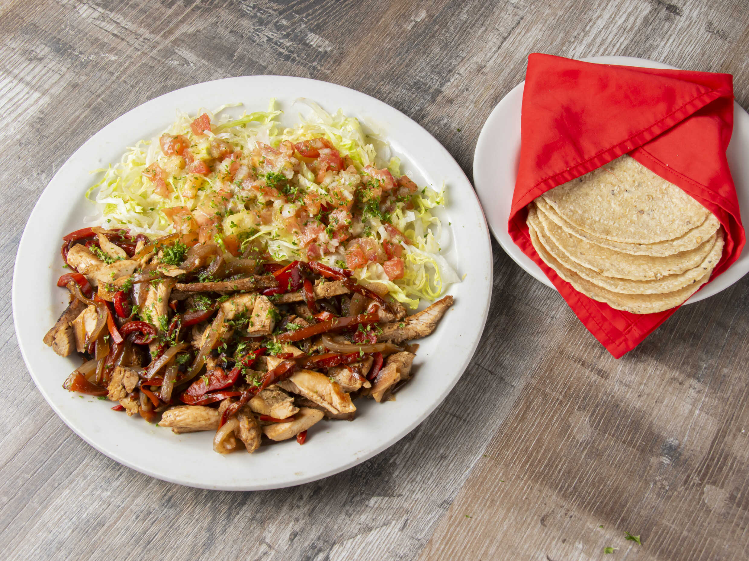 Tortillas de maíz, carne o pollo, pimentón, cebolla, ensalada.