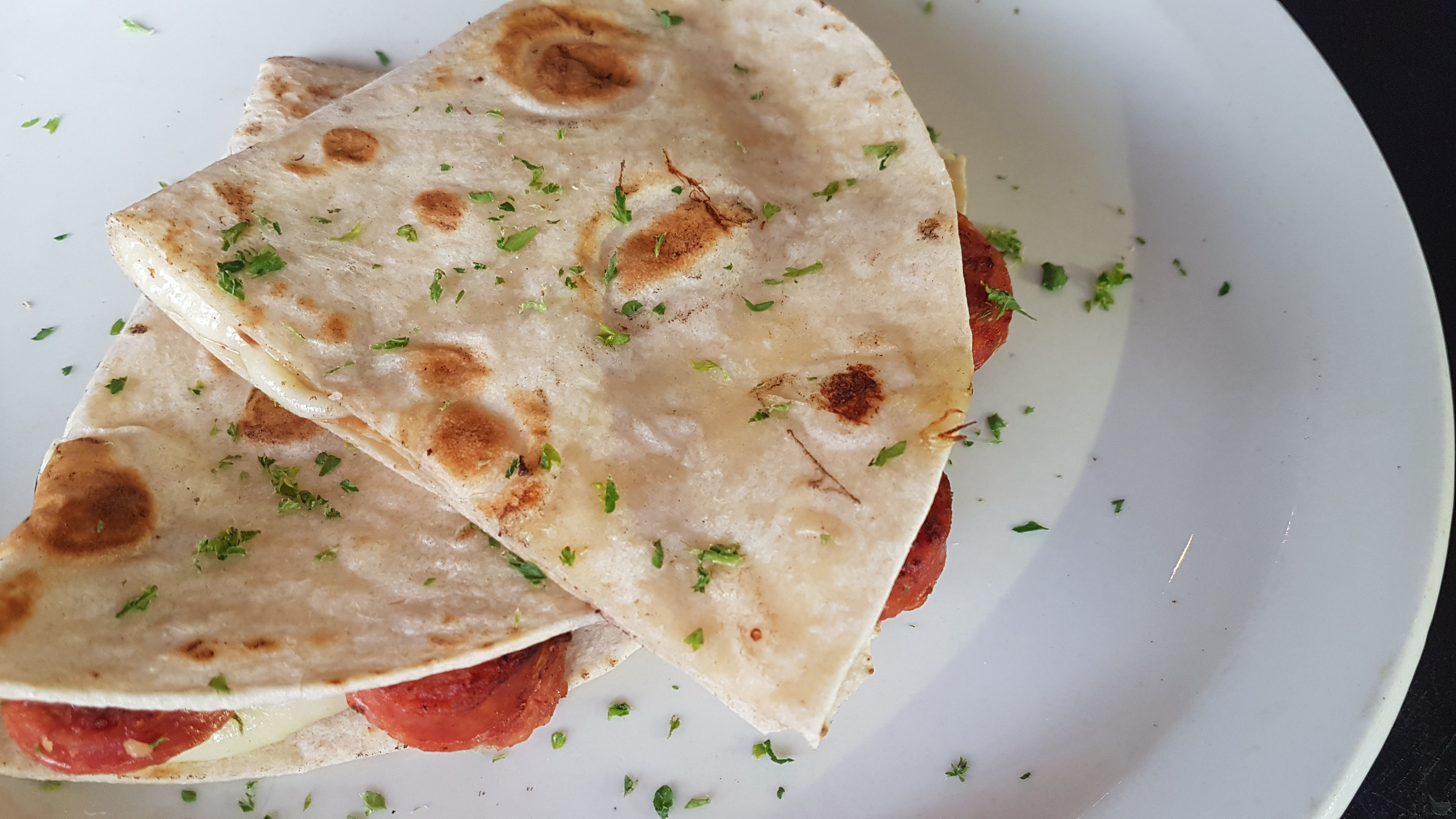 Tortilla , queso, chorizo, cebolla y pimentón.