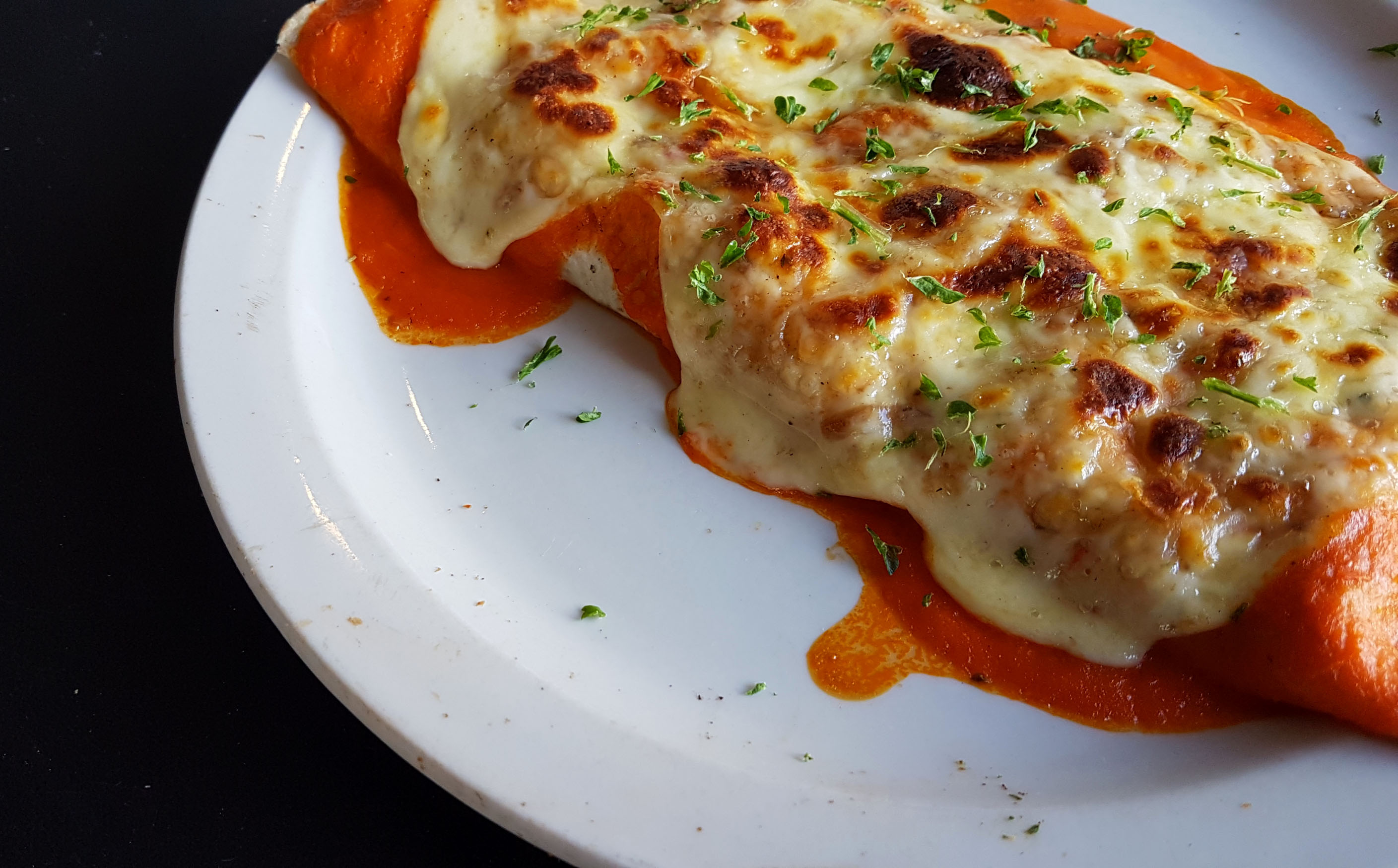 Tortilla rellena de espinaca, champiñones, cebolla, pimentón, recubierto con salsa mexicana y queso gratinado.