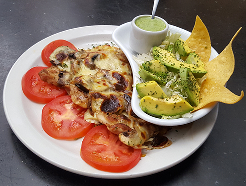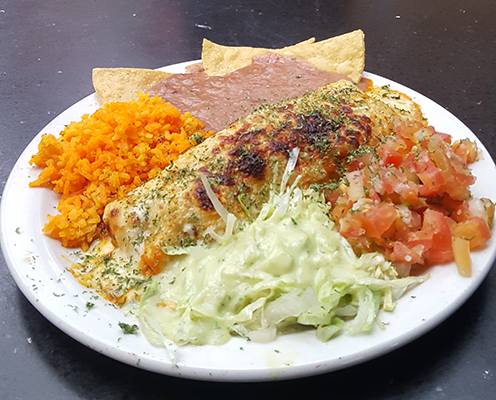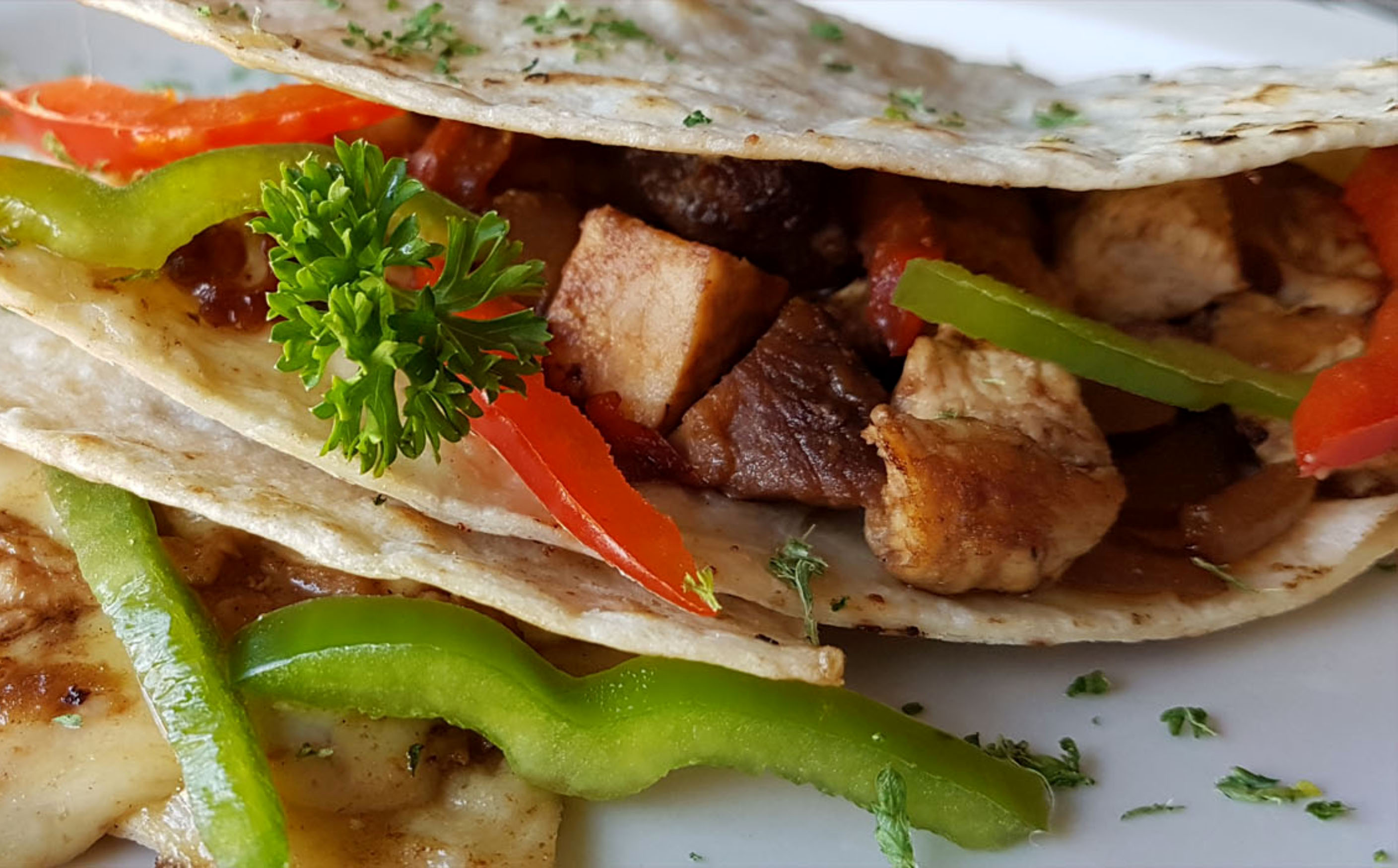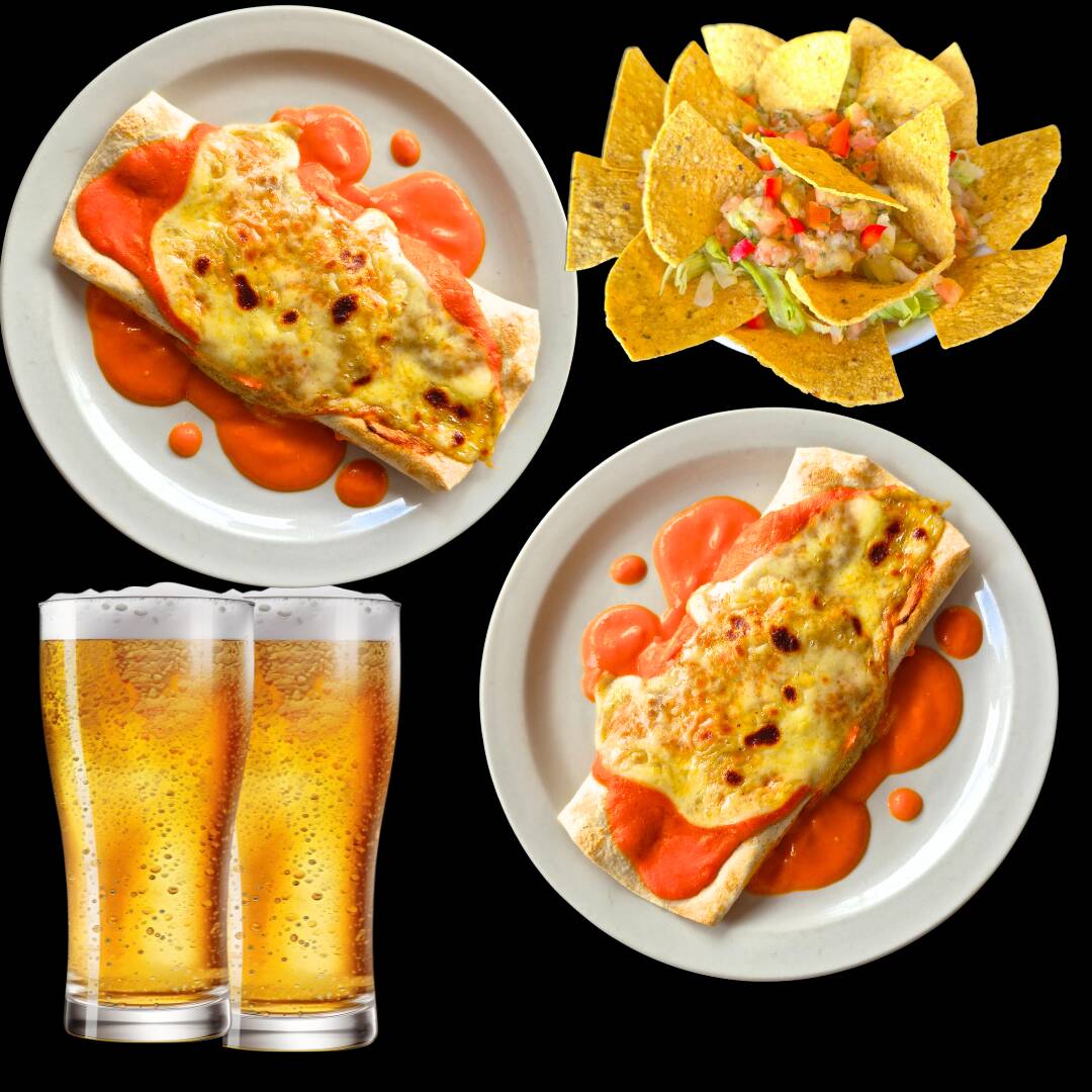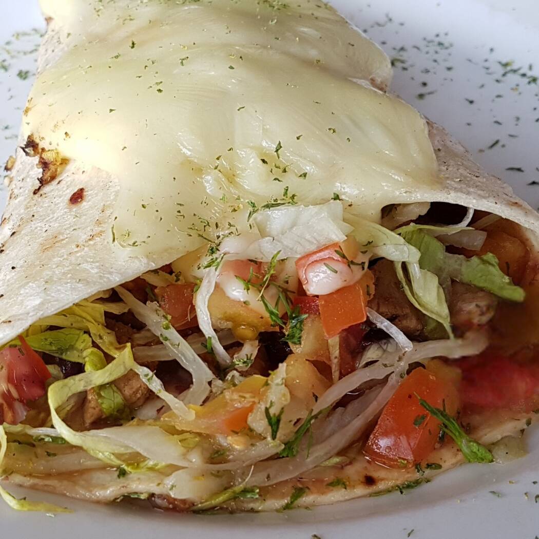 Tortilla rellena de carne al pastor o pollo, cebolla, pimenton, hot chili, recubierto con salsa mexicana y queso gratinado.
