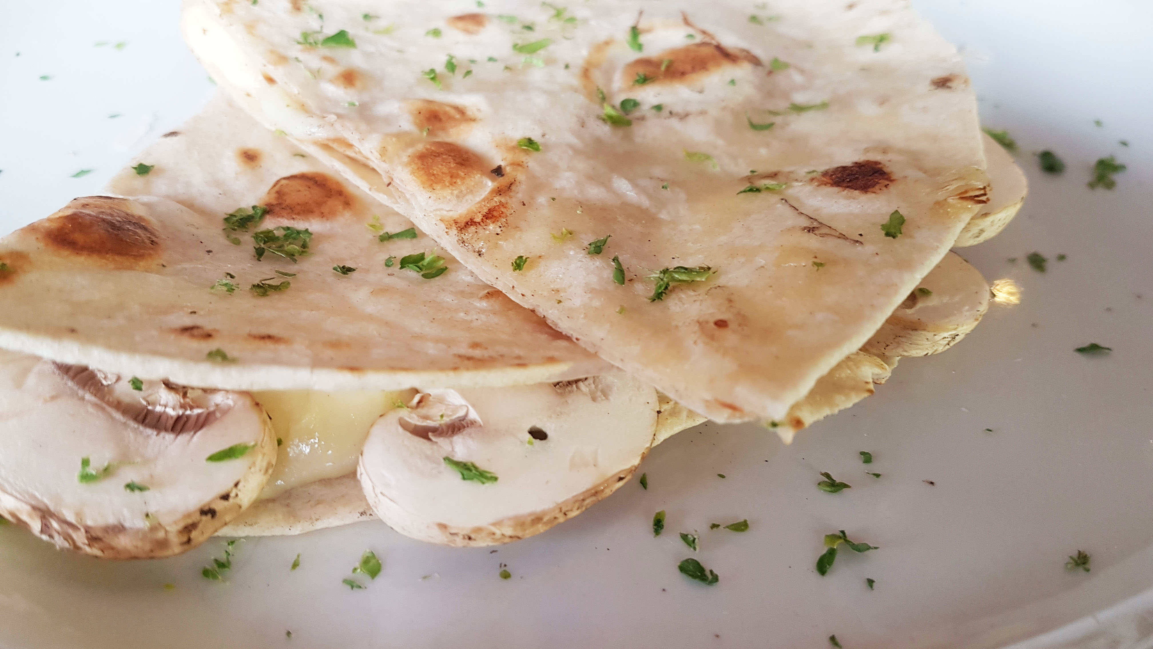 Tortilla con champiñón, queso fundido, guacamole, frijol negro, pimentón, cebolla, repollo, pico de gallo.