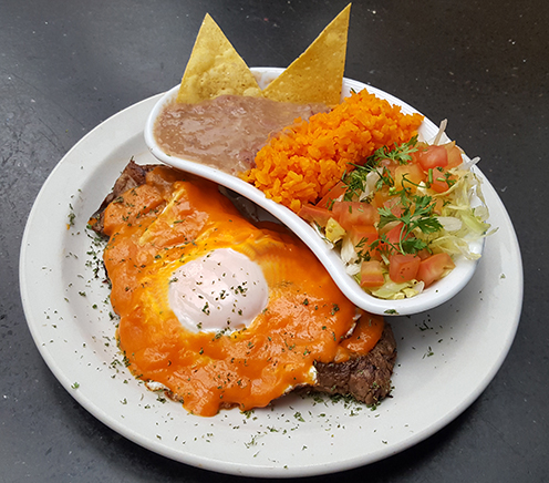 280 gr de churrasco, salsa ranchera, huevo, arroz, frijol, ensalada.