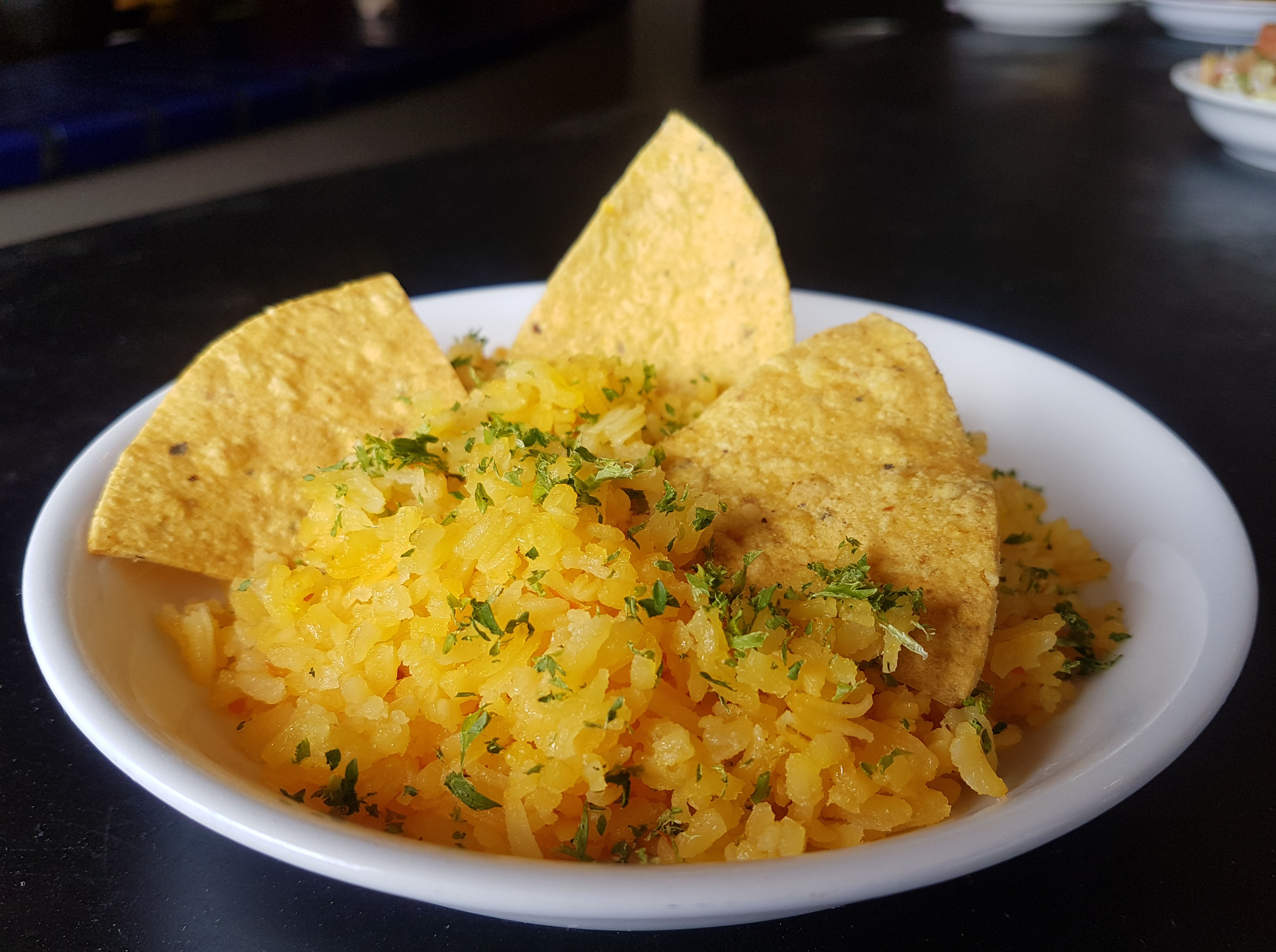 Arroz, chile con carne, pollo, jalapeño, vegetales, frijol negro, totopos.