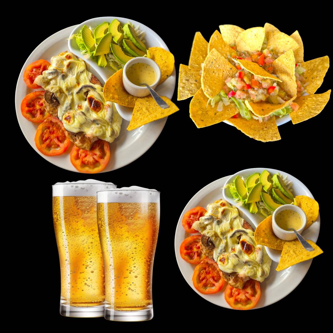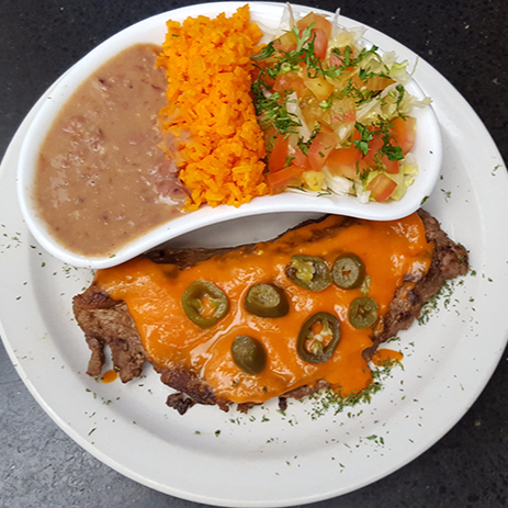 280 gr de churrasco, salsa ranchera, chiles, arroz, frijol, ensalada.