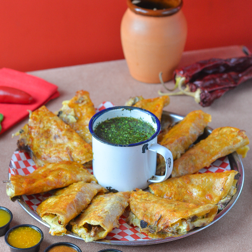 Tortillas de maíz mojadas en caldo de birria a la plancha, con dos costras de queso mozzarella.