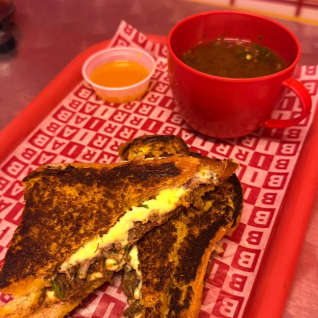 Sandwich con queso mozzarella + carne de birria acompañado de consome y salsa de uchuva