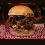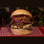 Hamburgesa de doble carne de res Angus + Birria de res desmechada, mermelada de tocineta en reduccion de tequila, queso mozarella, vegetales, Pan de papa.