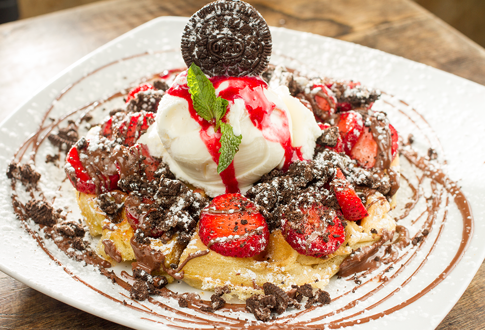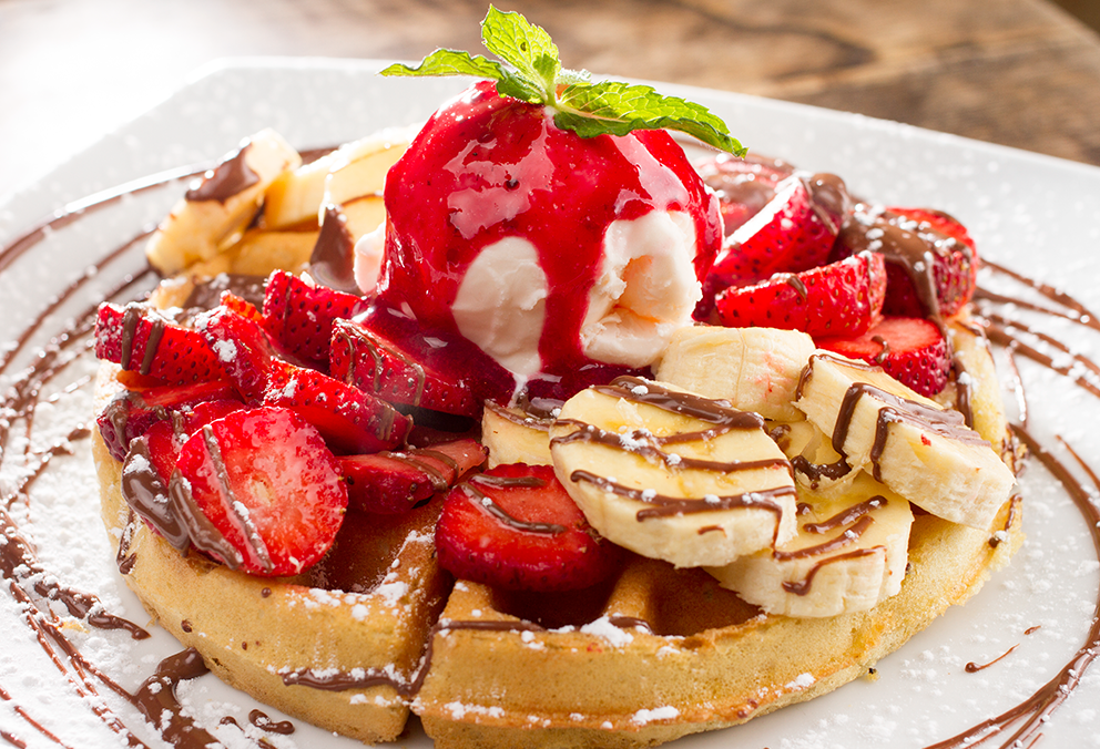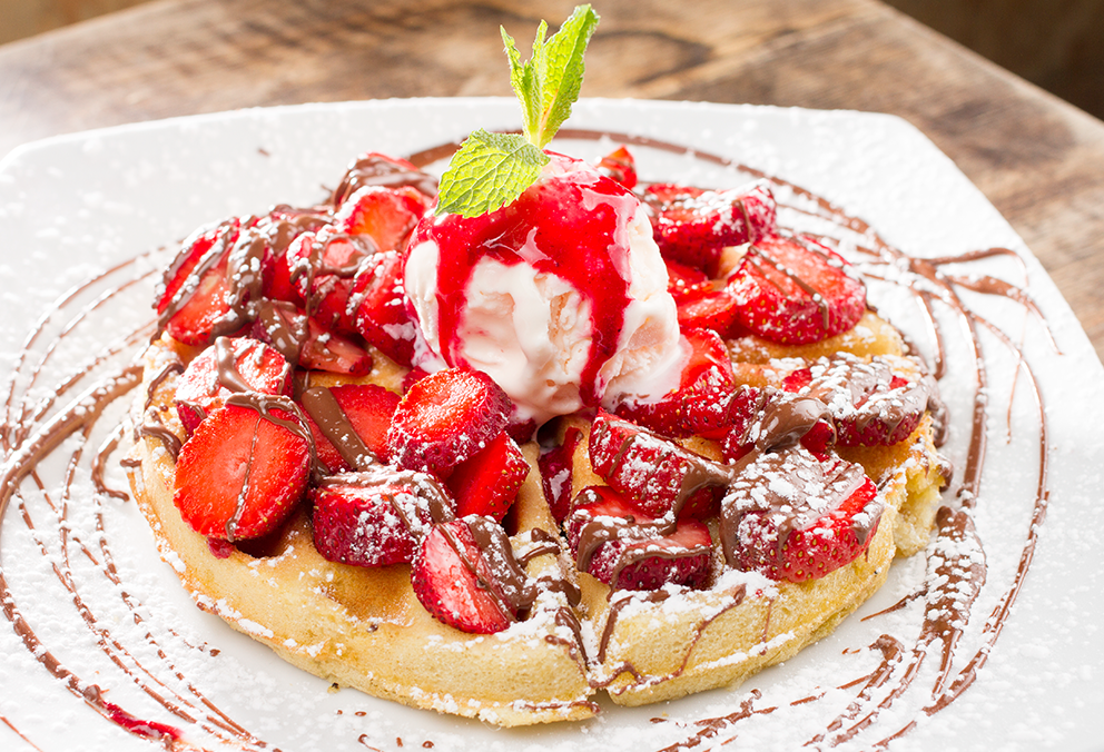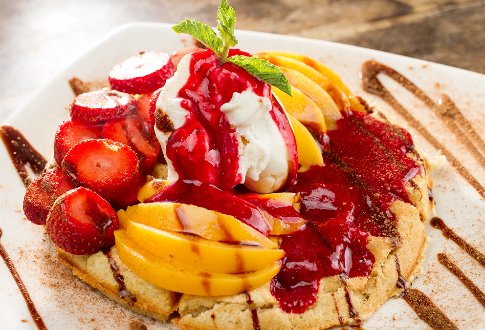 Waffle con dulce de mora caliente, chocolate, rodajas de fresas, duraznos, acompañado de helado de vainilla y un toque de canela.