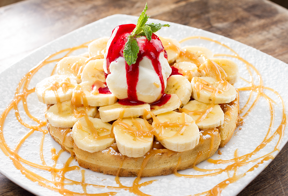 Waffle con banano en rodajas, arequipe y helado de vainilla.