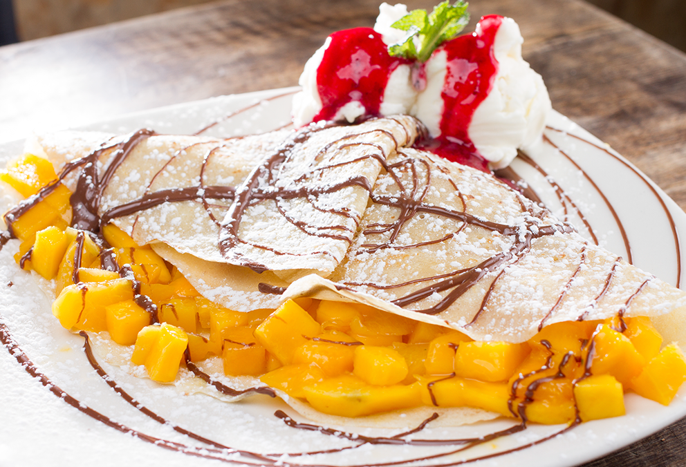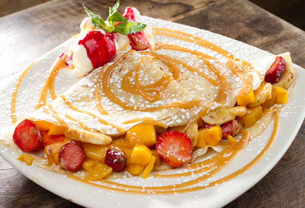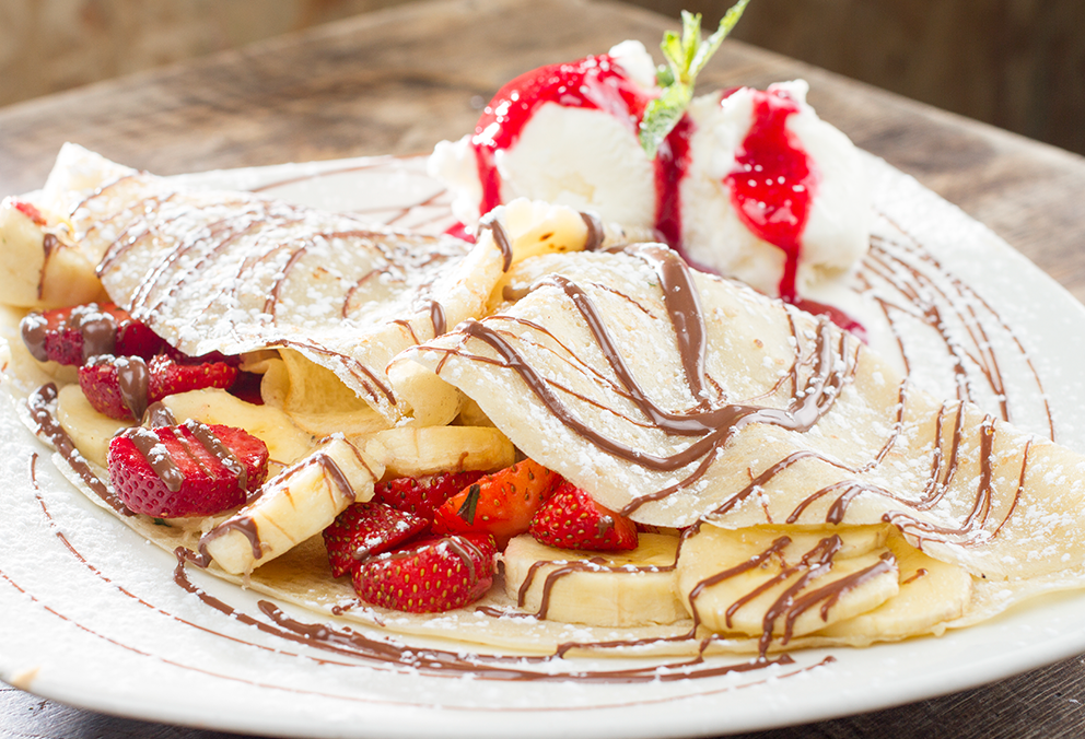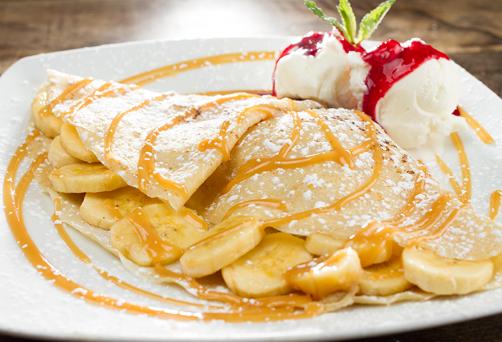Crepe con banano en rodajas, queso doble crema, arequipe y helado de vainilla.