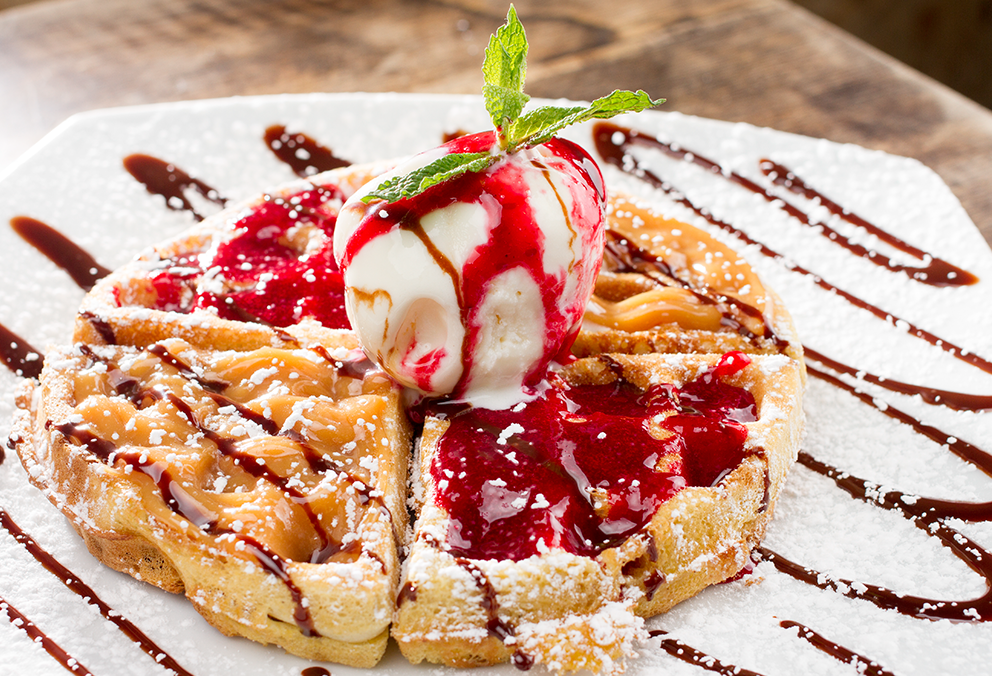 Waffles con tres combinaciones de salsas, mora caliente, arequipe y chocolate con helado de vainilla.