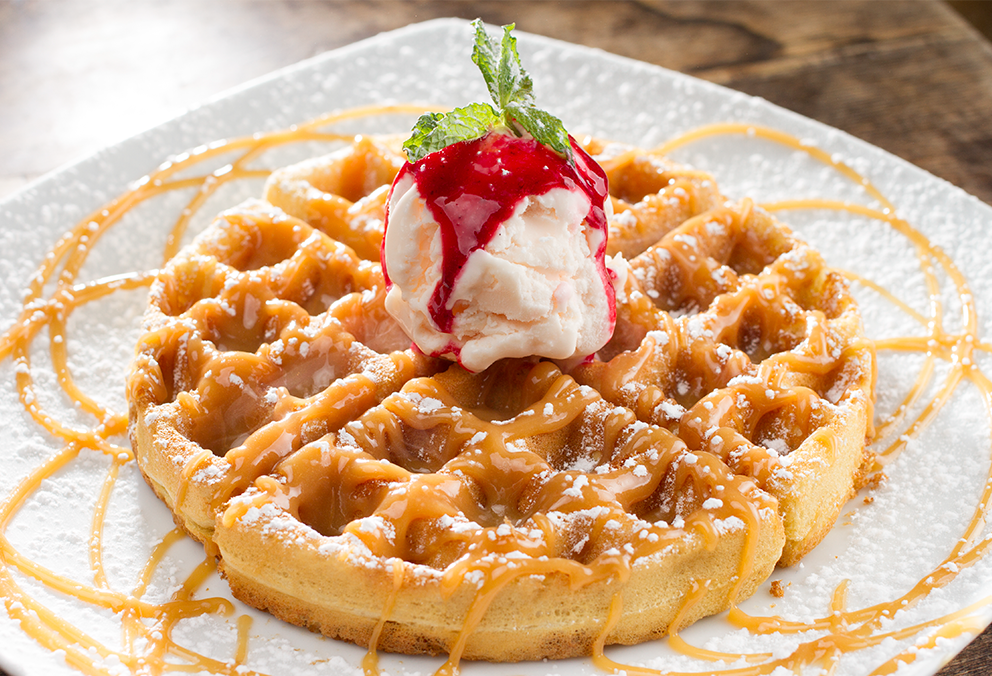 Waffle con arequipe y helado de vainilla.