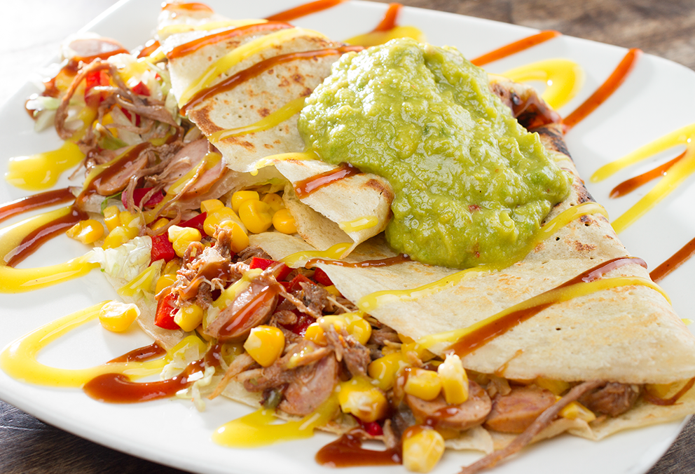 Carne desmechada, maíz tierno, chorizo ahumado, pimentón, lechuga, queso doble crema, guacamole y salsa criolla.