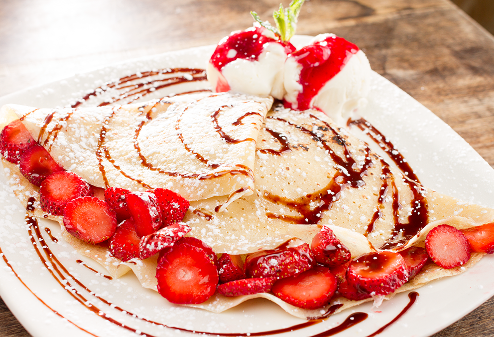 Crepe con fresas, queso derretido, bañado en crema de leche y acompañado de helado.
