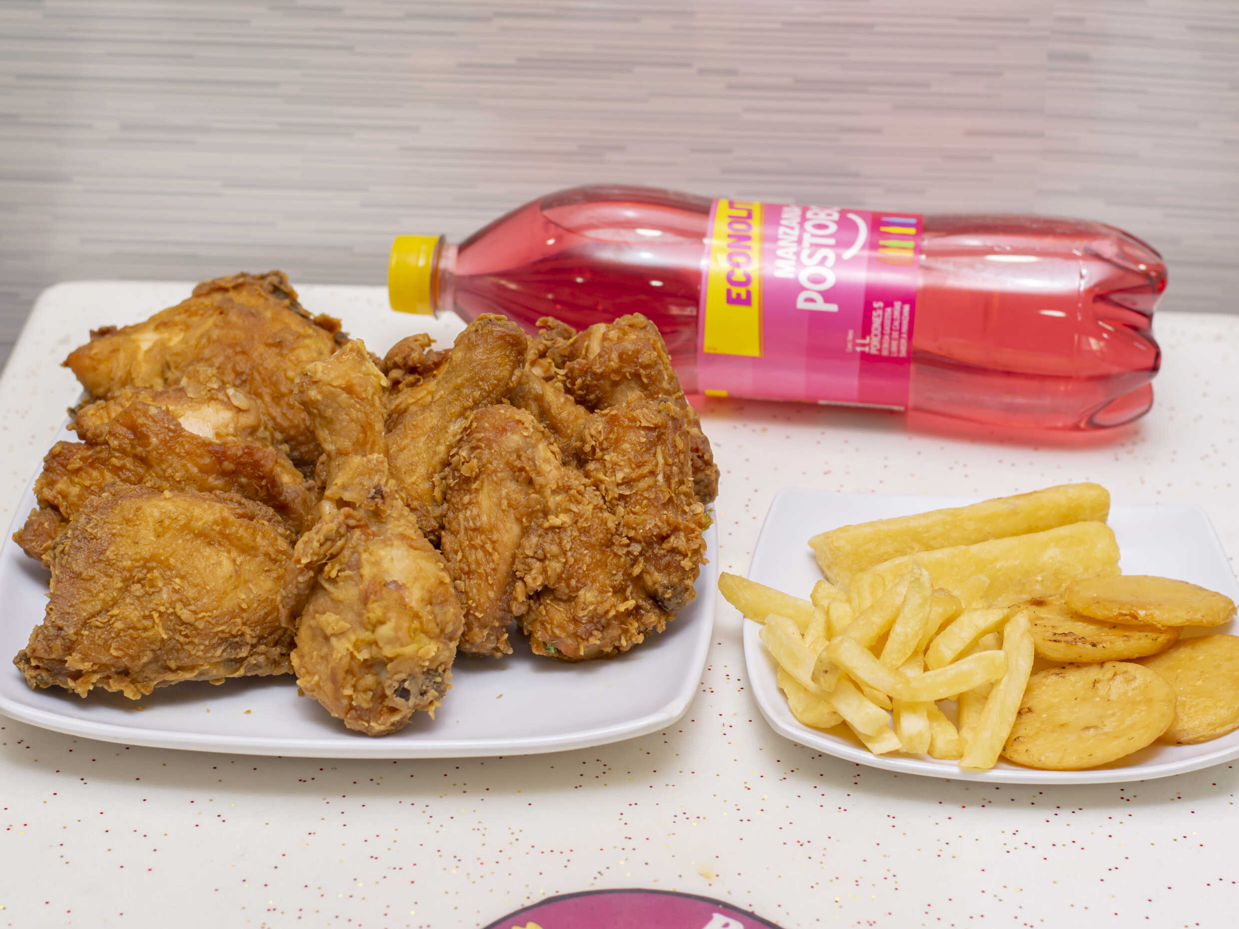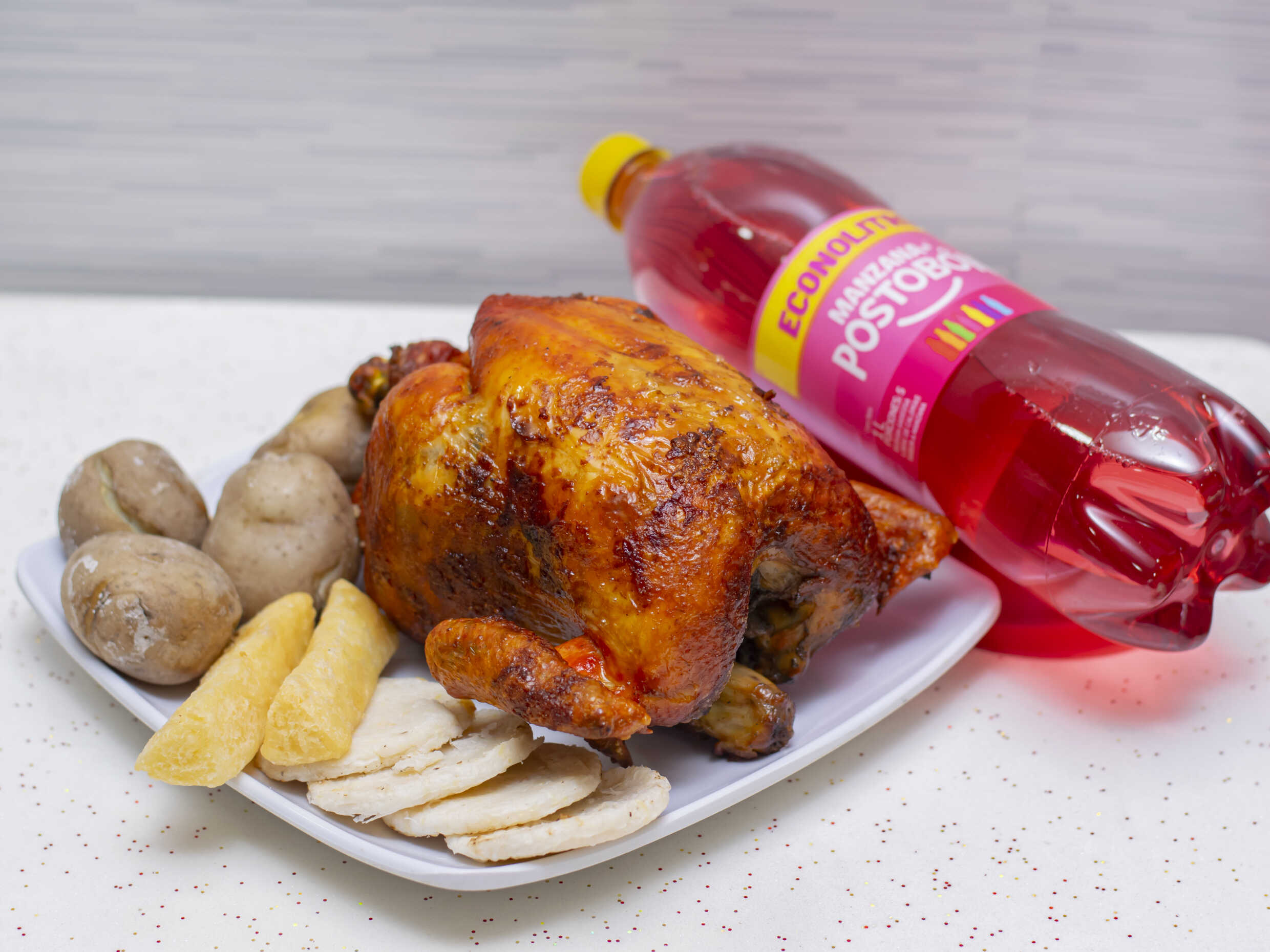 1 Pollo asado, papas saladas, arepa, 2 sopas del día, 2 porciones de arroz, 1 gaseosa Postobón 1 L (sabor sujeto a disponibilidad de la tienda).