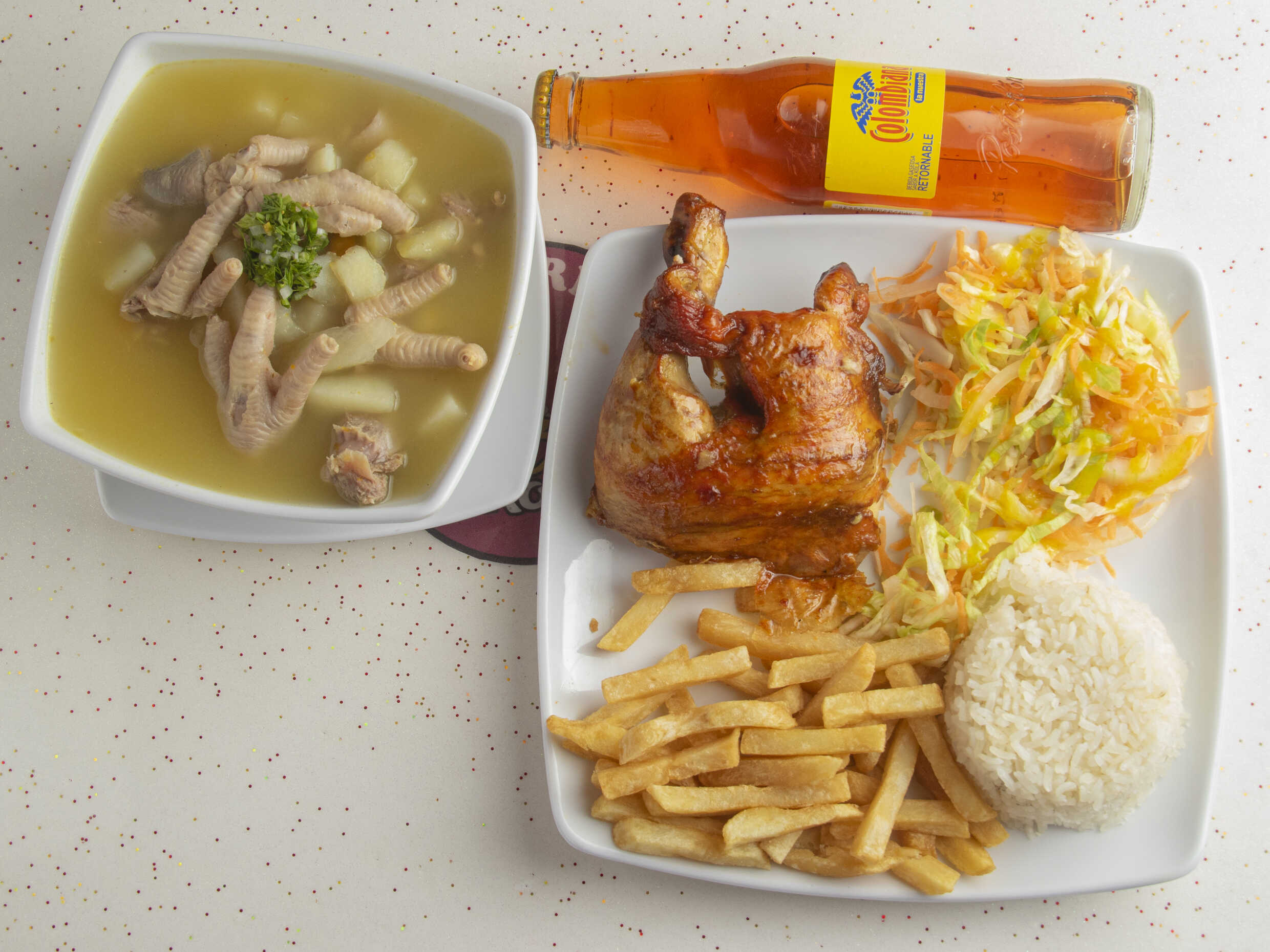 1/4 de pollo, papa francesa, arroz, ensalada, gaseosa mini postobón (sabor sujeto a disponibilidad de la tienda) y sopa del día