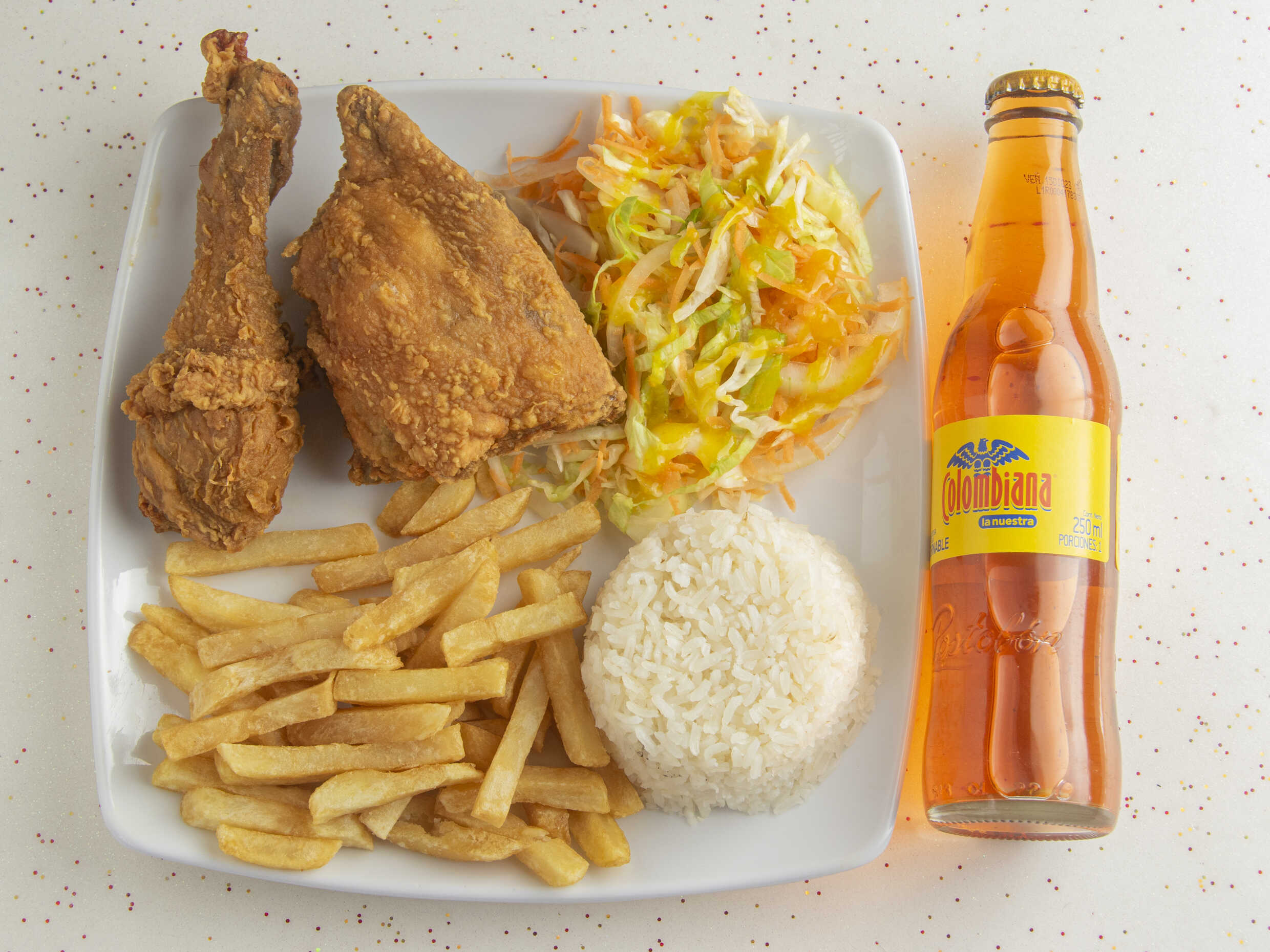 1/4 de pollo a elegir, papa francesa, arroz, ensalada y gaseosa 250 ml postobón (sabor sujeto a disponibilidad de la tienda)