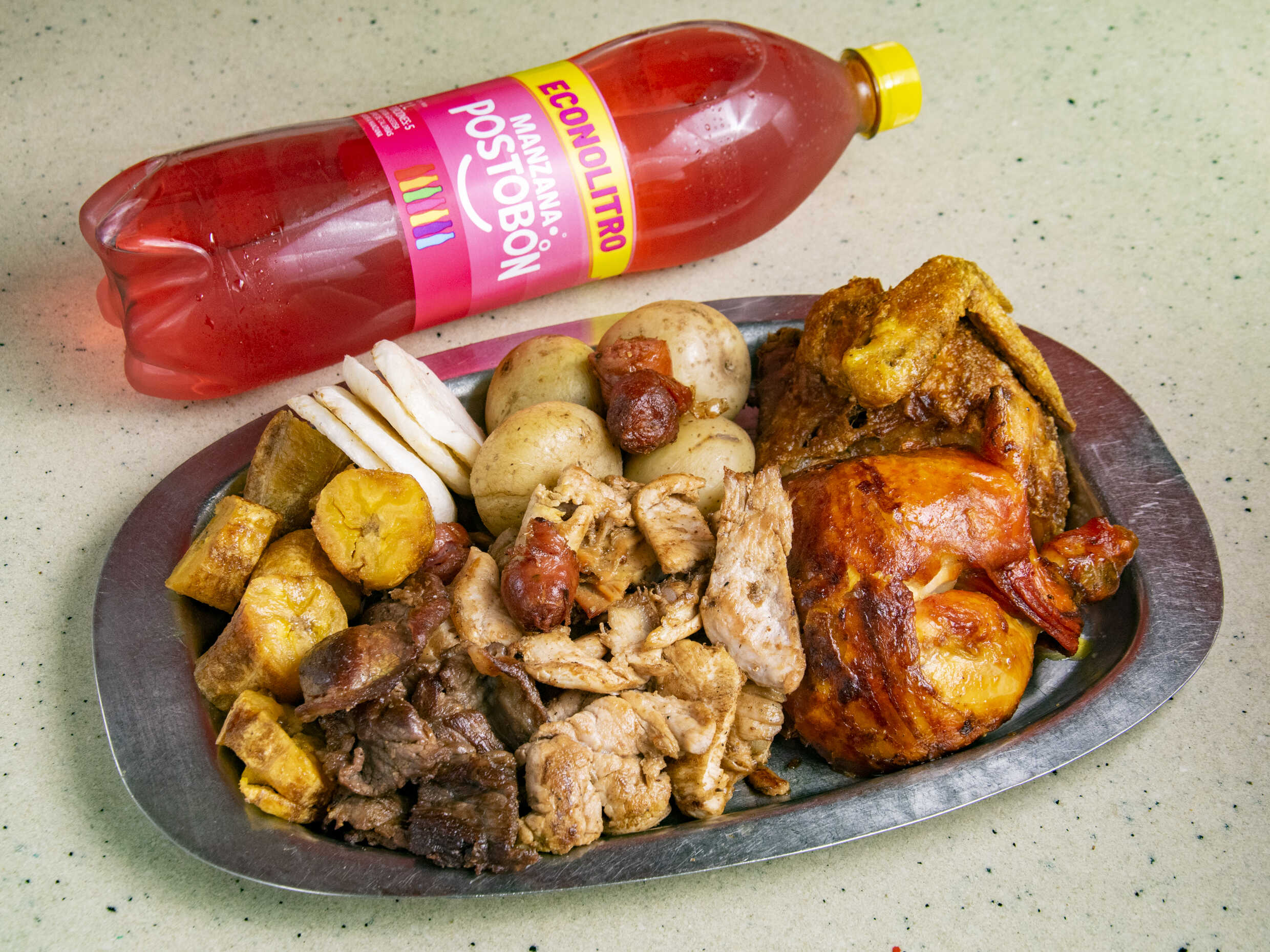 1 Pollo asado, carne de res, carne de cerdo, pechuga, chorizo, papa salada, papa francesa, yuca, patacón y gaseosa 1.5 L.
