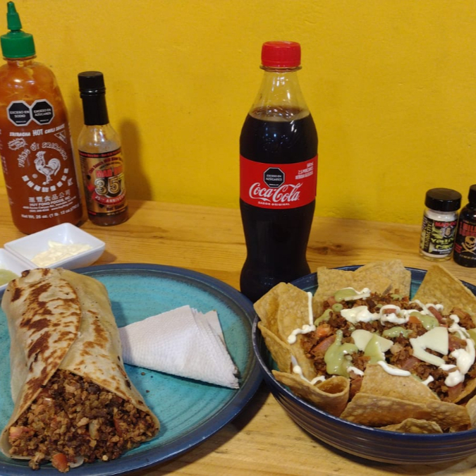 Burro con carne molida, ensalada pico de gallo, queso, salsa de la casa y lechuga, con Nachos de carne molida, sour cream, ensalada pico de gallo con queso y una gaseosa 400 ml (sabor sujeto a disponibilidad de la tienda).