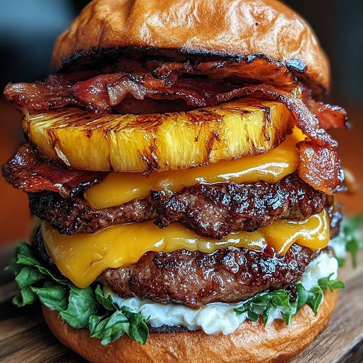 Pan de hamburguesa, doble carne de hamburguesa premium 100gr c/u vegetales frescos, queso cheddar tocino con cebolla caramelizada y 1 rodaja de piña asada en BBQ, acompañada de 100gr de papas francesa+ 1 gaseosa 250ml