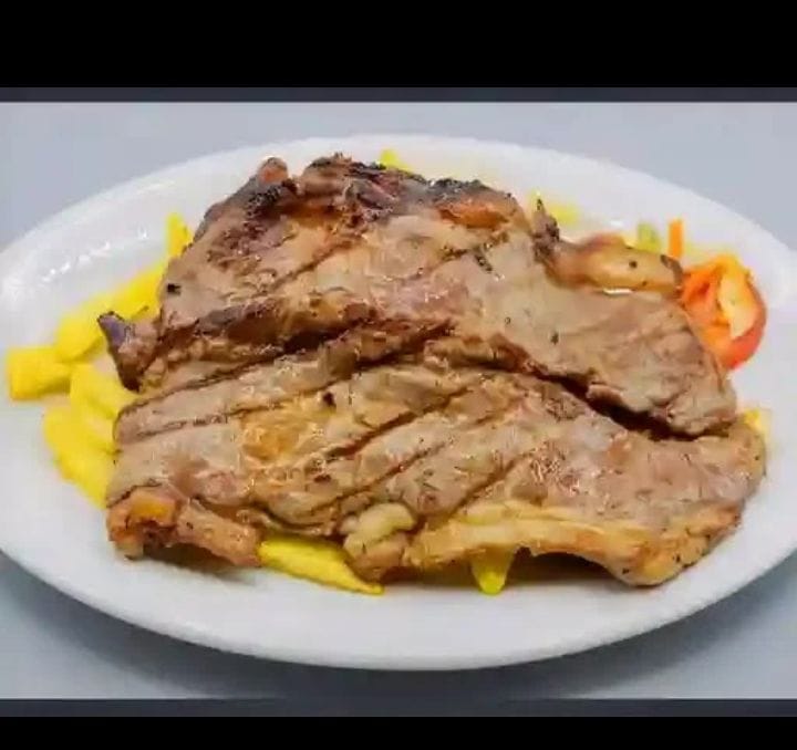 Costilla de cerdo con arroz, papas a la francesa, yuca, ensalada, aguacate, sopa o fruta.
