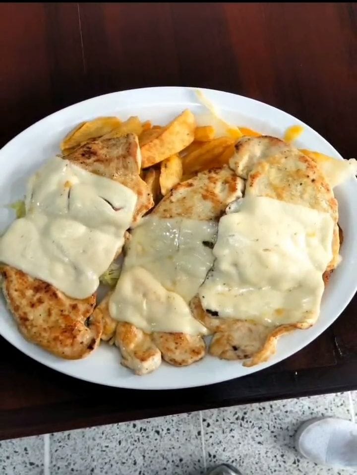 Pechuga con arroz, papas a la francesa, yuca, ensalada, aguacate, sopa o fruta.