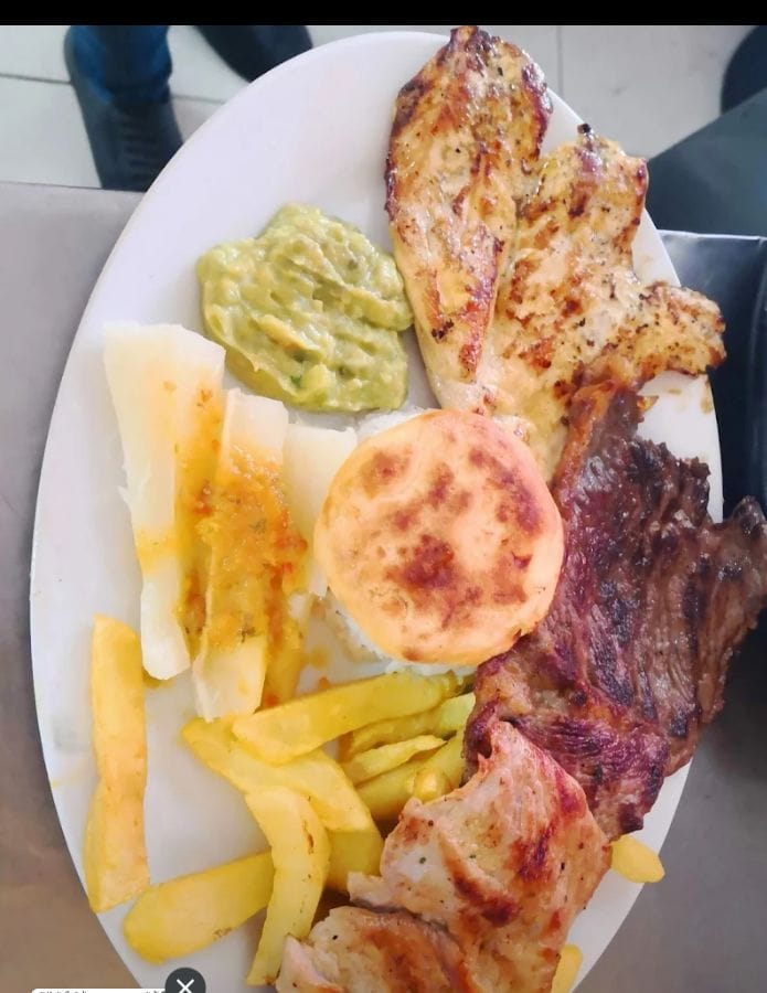 Churrasco con arroz, papas a la francesa, yuca, ensalada, aguacate, sopa o fruta.