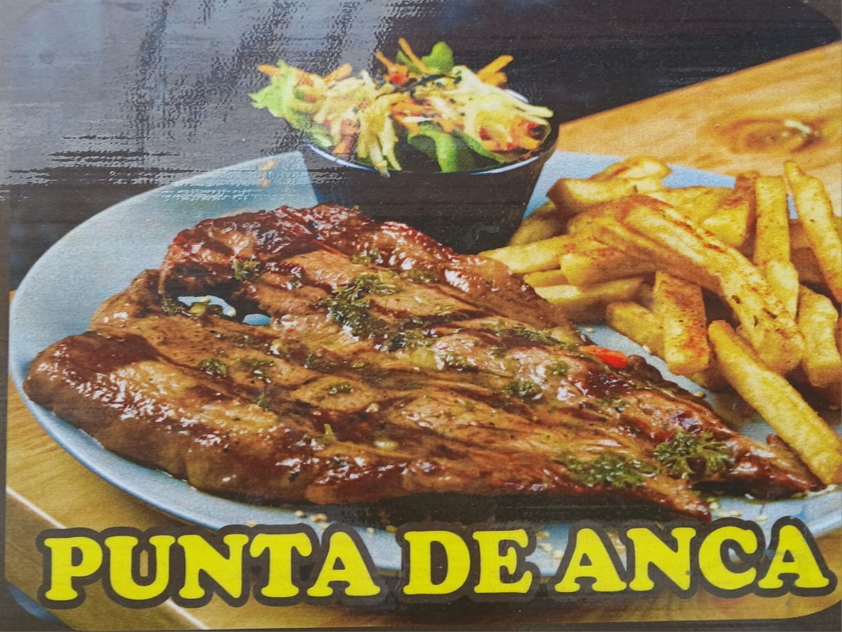 Punta de anca con arroz, papas a la francesa, yuca, ensalada, aguacate, sopa o fruta.