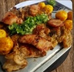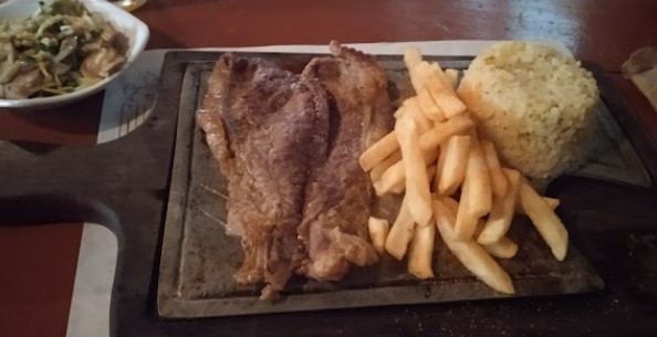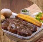 Res, cerdo, pechuga, chorizo, 410 g acompañados de papa criolla, arroz y ensalada de la casa.