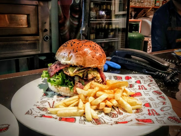 Carne artesanal, pollo, tocineta, queso mozzarella, vegetales (cebolla, tomate, lechuga y chimichurri), papa francesa y gaseosa personal.