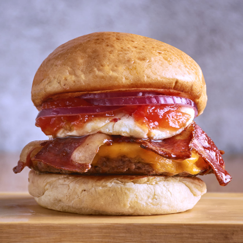 Carne artesanal, pan brioche, mix de quesos cremosos, doble tocineta, tomate dulce y cebolla.