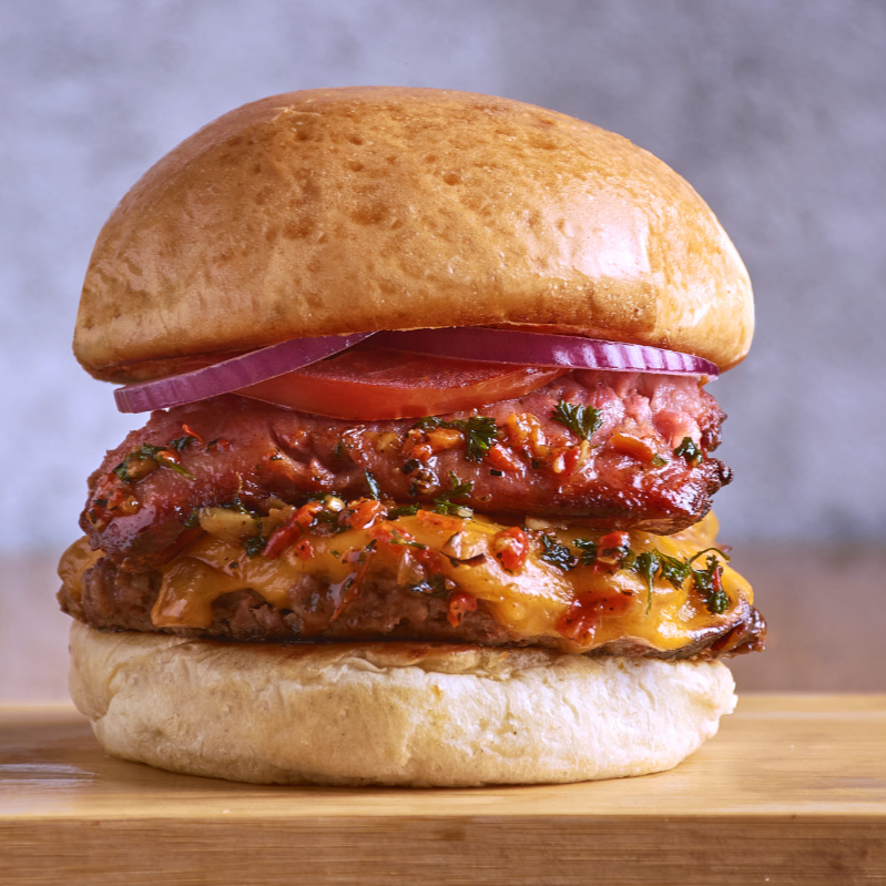 Doble carne artesanal, pan brioche, queso cheddar, salsa de chile dulce (levemente picante), doble tocineta, cebolla y salsa de la casa.