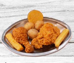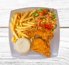 Bandeja con 1/4 de pollo broaster, arroz y papa a la francesa.