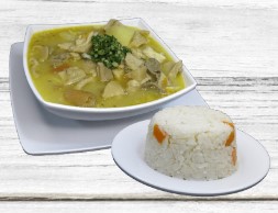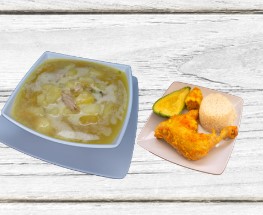 Ajiaco con pollo, pierna pernil sudado, mazorca, aguacate y arroz.