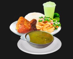 Bandeja con 1/4 de pollo asado, arroz, papa, sopa, limonada natural y ensalada.