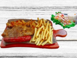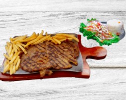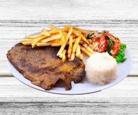 Sobrebarriga a la plancha, papa a la francesa, ensalada y arroz.