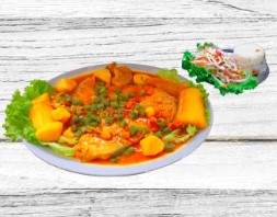 Sobrebarriga en salsa, papa al vapor y arroz.