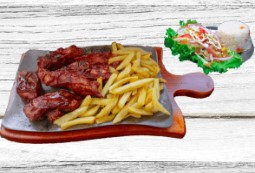 Costillas ahumadas, papa a la francesa, arroz y ensalada.