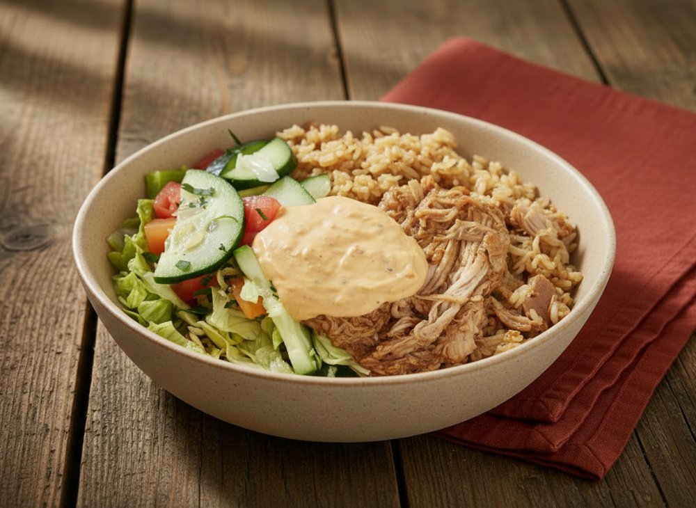 Bowl a base de arroz integral con pollo mexicano, hummus de pimentón, pepino, tomate y Lechuga.