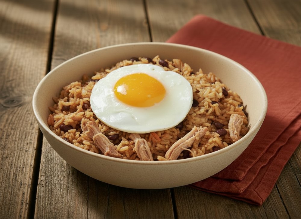 Arroz achiotado, cerdo BBQ,frijoles negro, platano frito y huevo frito.
