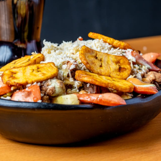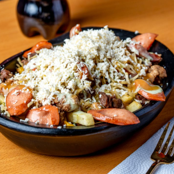 400 Gramos de papa francesa, costilla de cerdo, pollo y carne salteados, maíz tierno, salchicha Zenú, maduro frito, queso costeño, papa cabello de ángel, salsas de la casa.