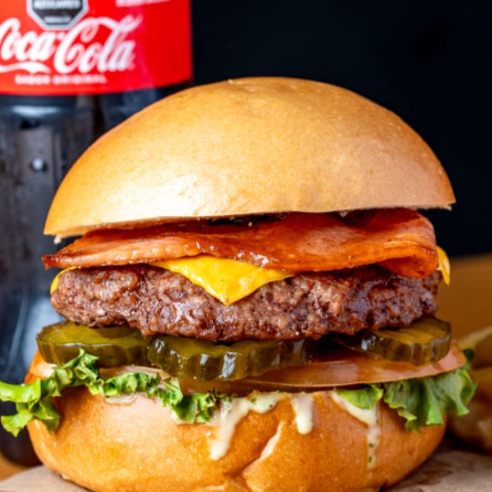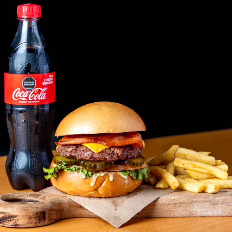 hamburguesa de res premium 120gr con pepinillos lechuga tomate pan artesanal papas y gaseosa 250mk