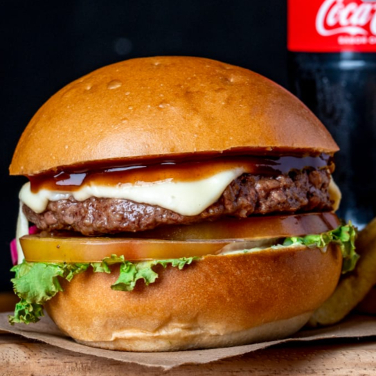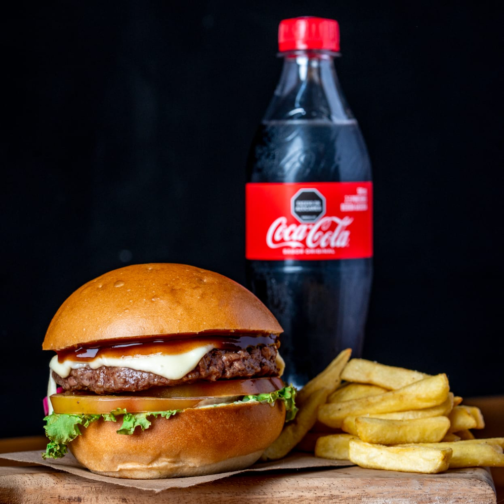 hamburguesa de res premium 120gr con queso doble crema vegetales frescos oan de la casa acompapado de papas fritas y gaseosa 250ml