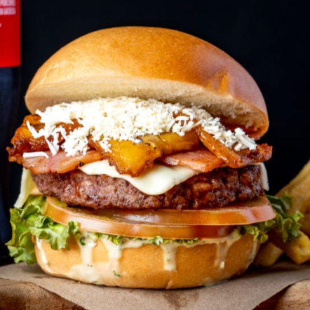 hamburguesa de res premium 120gr con maduro frito queso doble crema y costeño vegetales frescos pan artesanal papas fritas y gaseosa 250ml