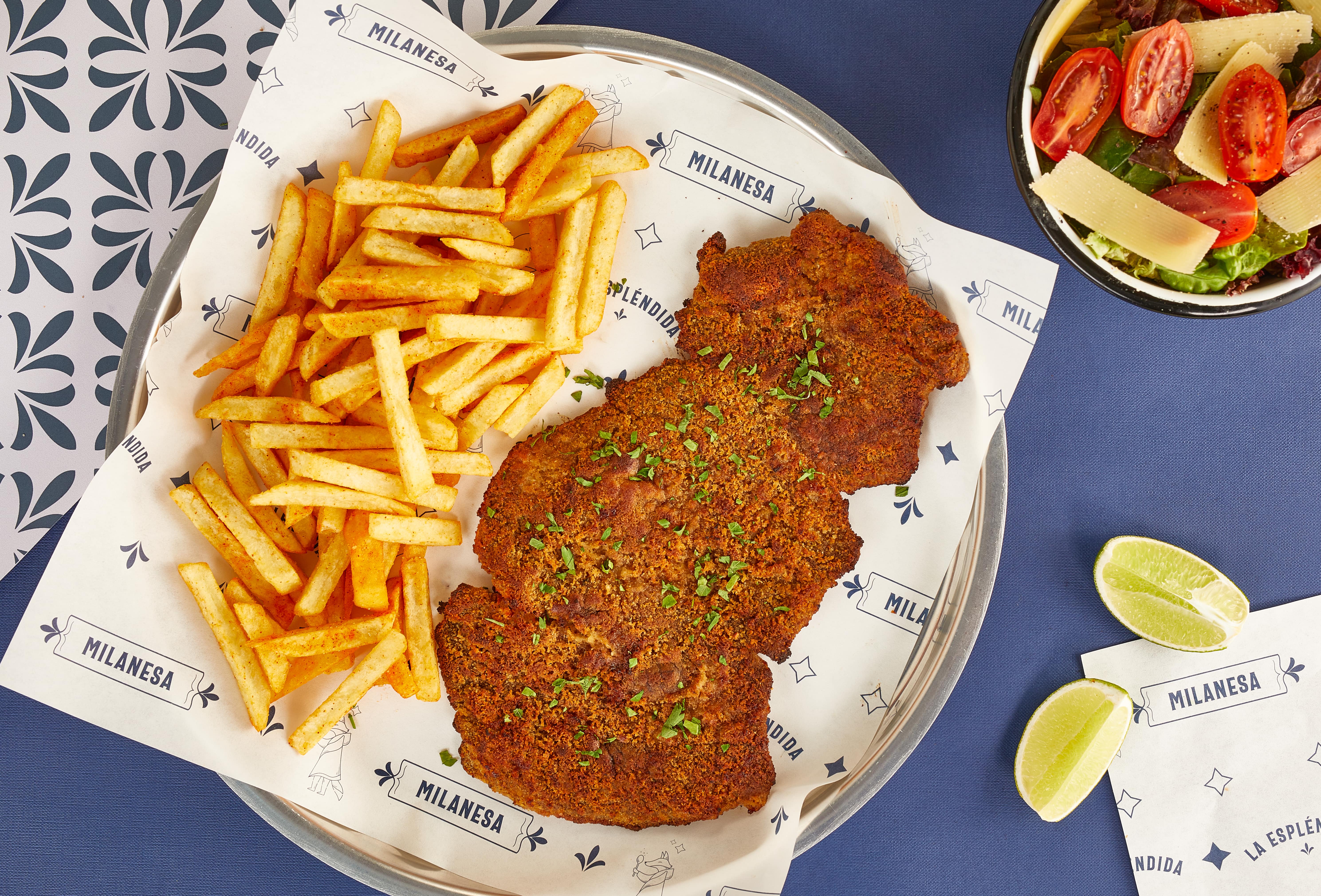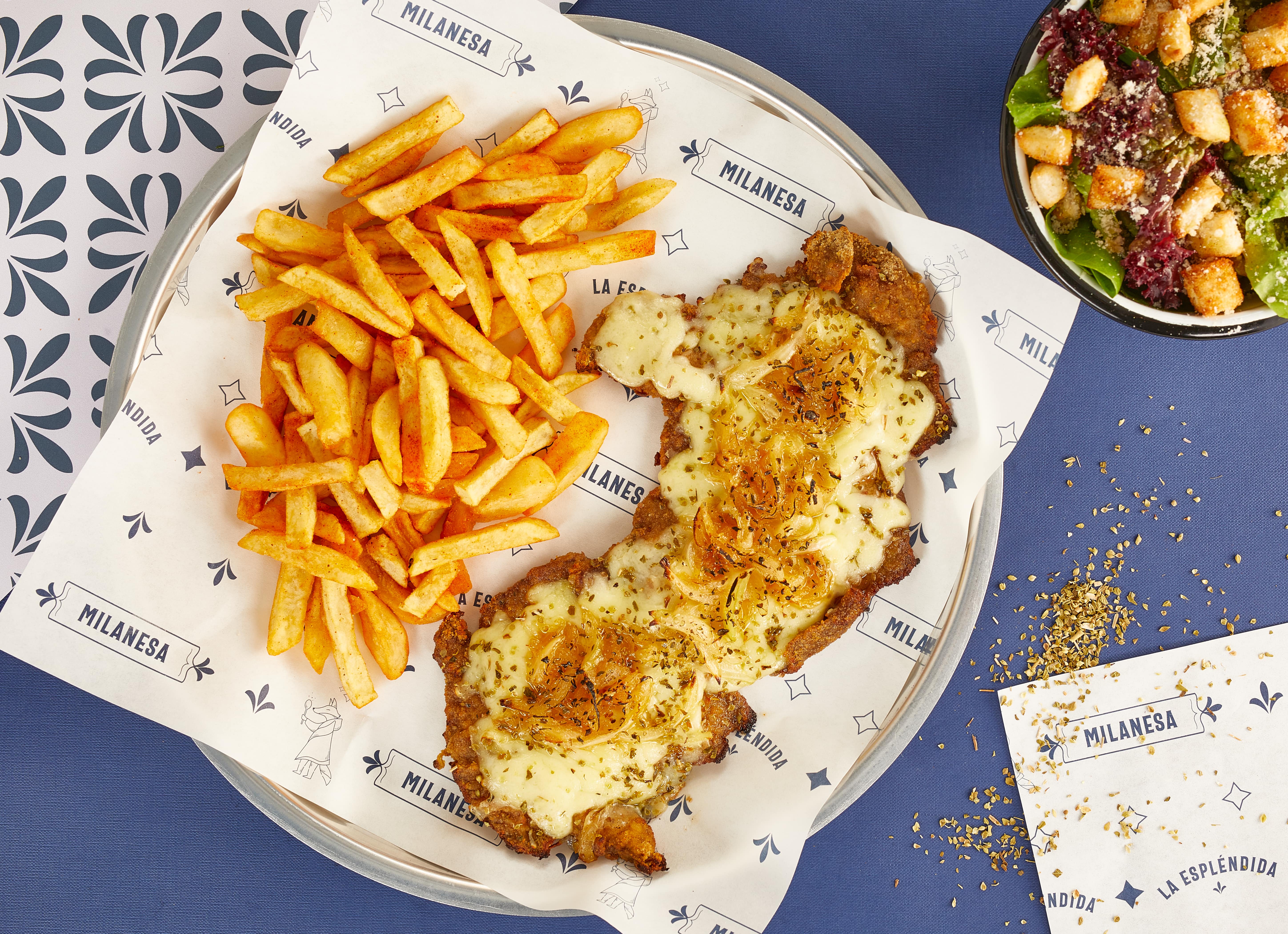 Milanesa al horno con proteína a tu elección, queso mozzarella, cebolla en pluma salteada y orégano acompañado de 200g de papa francesa.